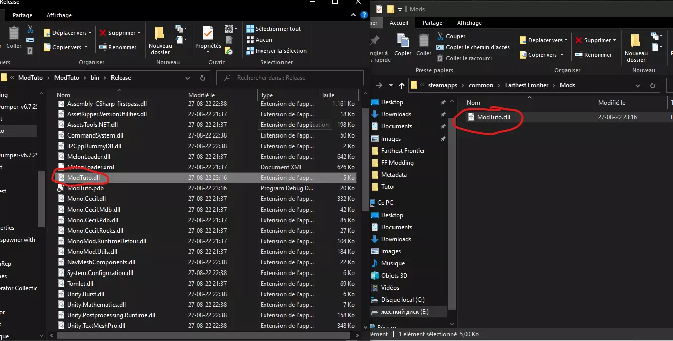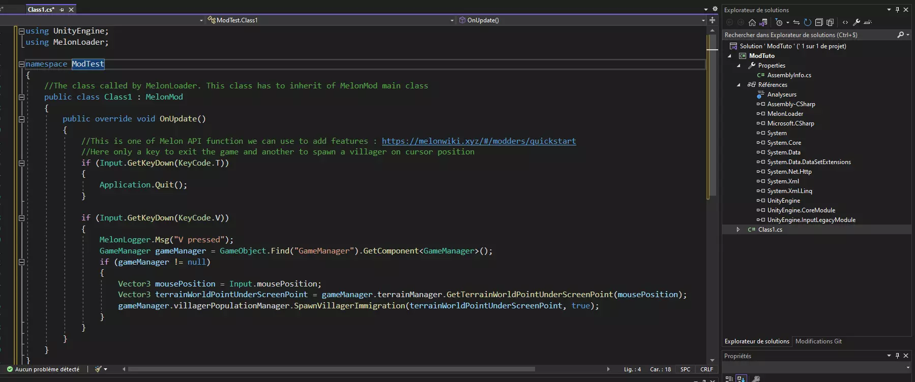 使用UnityEngine; 使用MelonLoader; 命名空间ModTuto { //MelonLoader调用的类。此类必须继承MelonMod主类 public class Class1 : MelonMod { public override void OnUpdate() { //这是我们可以用来添加功能的Melon API函数之一 //这里只有一个退出游戏的按键和另一个在光标位置生成村民的按键 if (Input.GetKeyDown(KeyCode.T)) { Application.Quit(); } if (Input.GetKeyDown(KeyCode.V)) { MelonLogger.Msg("V键已按下"); GameManager gameManager = GameObject.Find("GameManager").获取组件<游戏管理器>(); 如果 游戏管理器 不等于 空 { 向量3 鼠标位置 = 输入.鼠标位置; 向量3 屏幕点下方的地形世界点 = 游戏管理器.地形管理器.获取屏幕点下方的地形世界点(鼠标位置); 游戏管理器.村民人口管理器.生成村民移民(屏幕点下方的地形世界点, 真); } } } } } 让我们安装我们的模组!生成Dll文件并将其放入【Mods】文件夹中