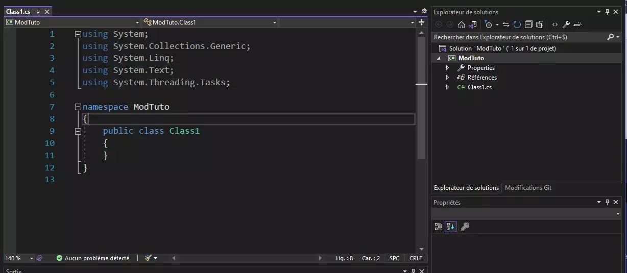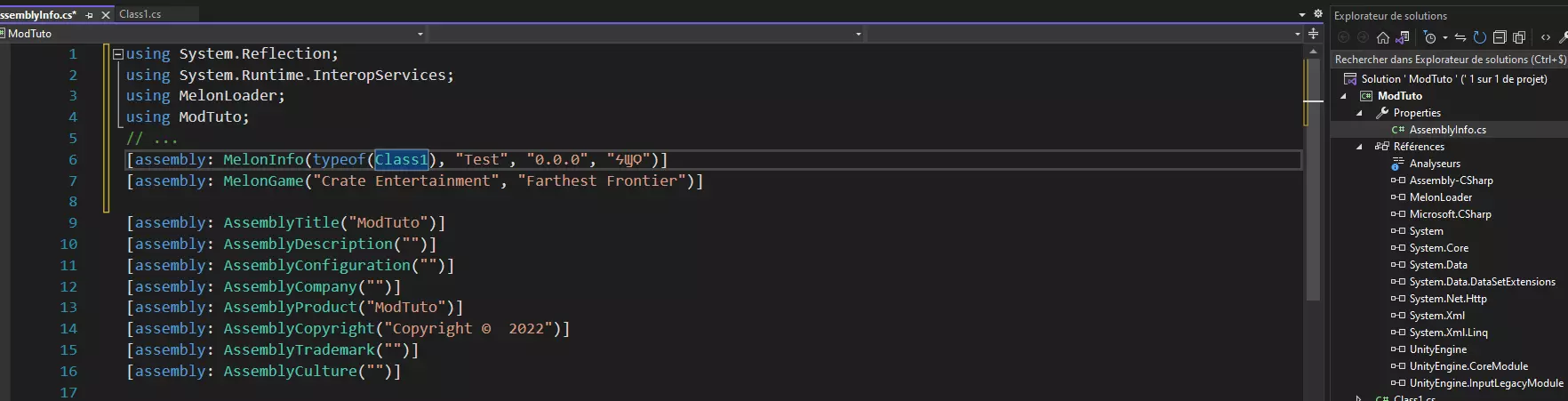 这些DLL文件的位置如下: Assembly-CSharp:位于名为【DummyDll】的文件夹内(步骤3:转储Unity DLL) MelonLoader:位于名为【MelonLoader】的文件夹内(步骤2:安装MelonLoader) UnityEngine:位于名为【DummyDll】的文件夹内(步骤3:转储Unity DLL) UnityEngine.CoreModule:位于名为【DummyDll】的文件夹内(步骤3:转储Unity DLL) UnityEngine.InputLegacyModule:位于名为【DummyDll】的文件夹内(步骤3:转储Unity DLL) 你必须至少将这5个DLL添加到你的模组项目中。注意【DummyDll】文件夹中还有更多DLL。其中最重要的是【Assembly-CSharp】,它包含游戏的大部分数据。当然,如果你想添加与Unity相关的特定内容,也可以添加其他DLL。 现在,通过【References】上方的工具图标展开【Properties】。它包含一个名为“AssemblyInfo.cs”的文件。打开该文件并添加以下内容: using System.Reflection; using System.Runtime.InteropServices; using MelonLoader; using ModTuto; // ... [assembly: MelonInfo(typeof(Class1), "Test", "0.0.0", "ϞϢϘ") ]//MelonInfo(typeof(Mod类), "游戏模组名称", "版本", "作者") [assembly: MelonGame("Crate Entertainment", "Farthest Frontier")] //MelonGame("工作室", "游戏")]