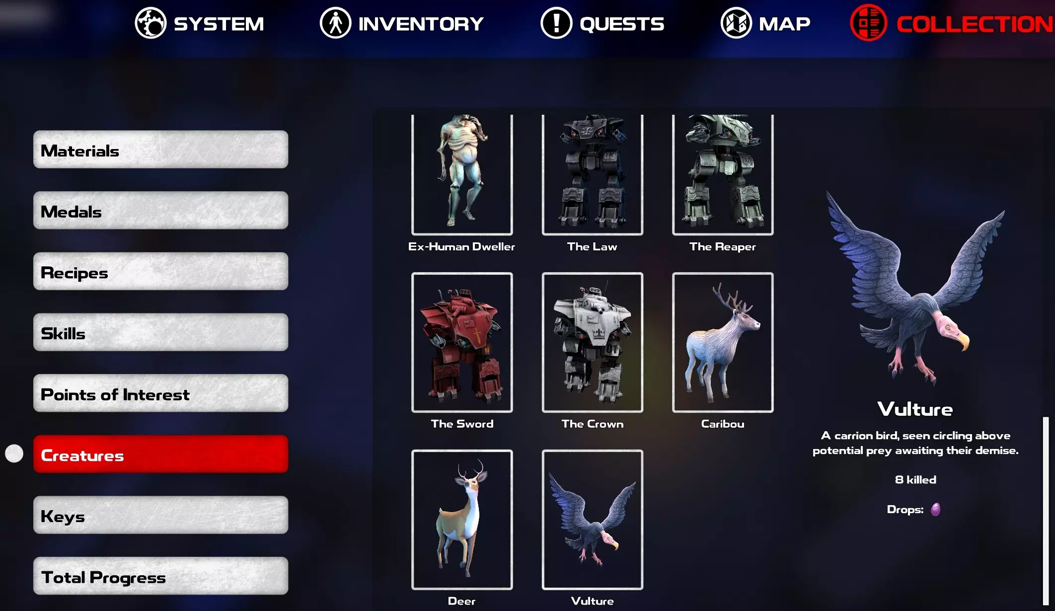 05. 隐藏的敌人 当你在菜单中打开此部分时,你的“收集”中可能缺少一种敌人类型,但你想找出它是什么以完成你的图鉴。 提示1:在(晒伤)沙漠中不要忘记你的水。 提示2:只有当你已经死亡时,它才会猎杀你。 答案:秃鹫。你可以在“晒伤沙漠”中找到它们。