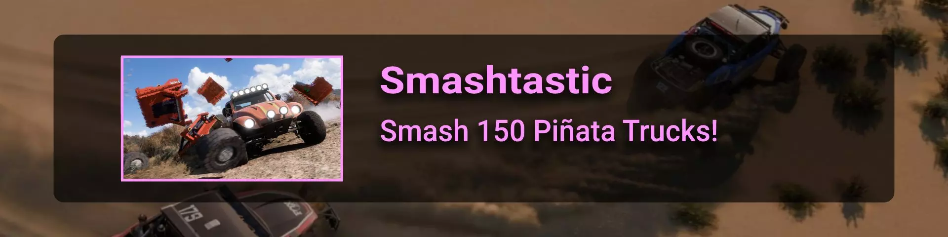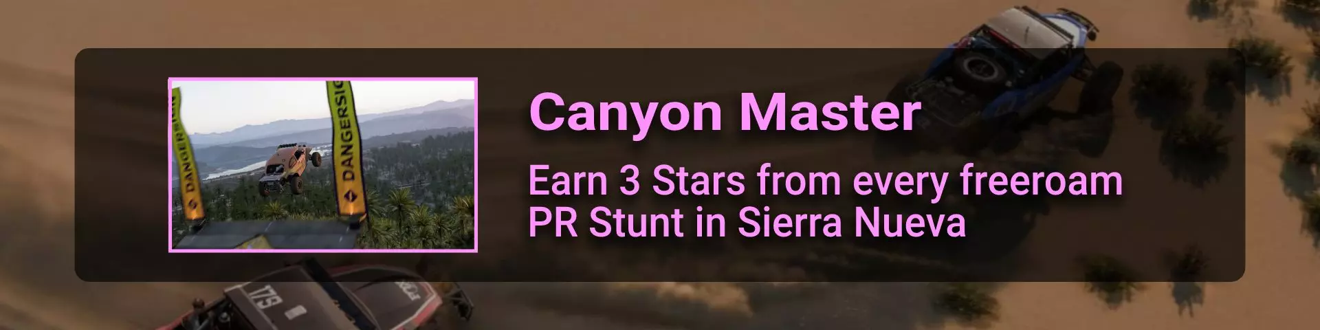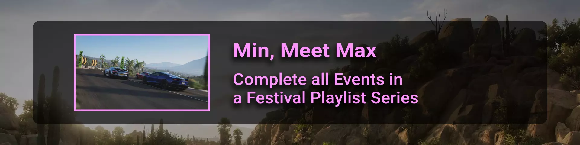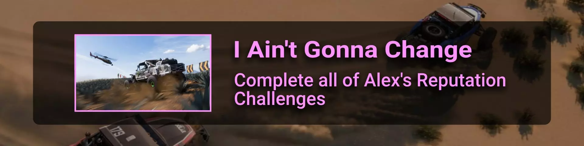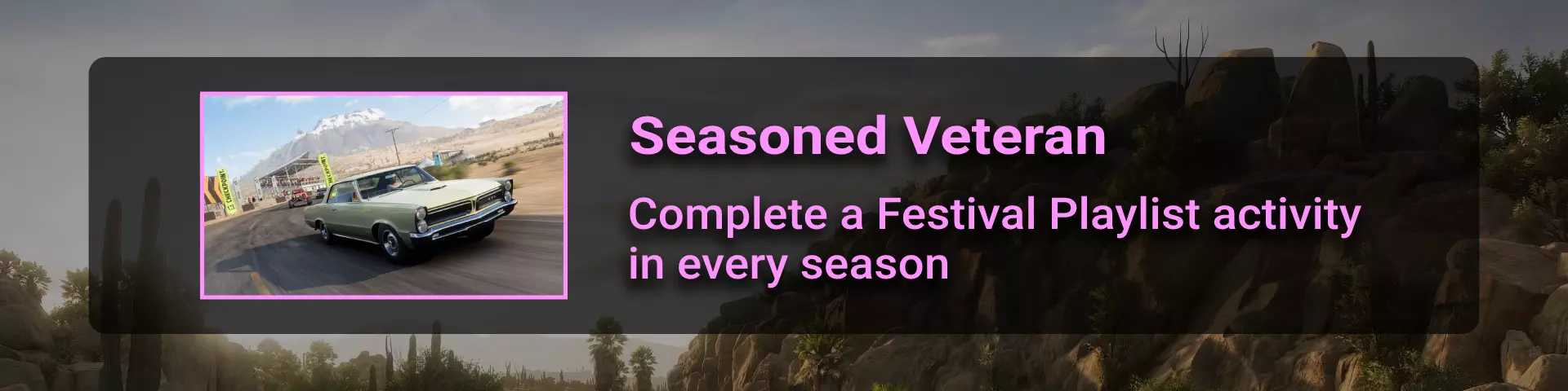 在本节中,我将介绍《极限竞速:地平线》系列玩家在环道赛中可能遇到的问题。 如果你计划达成100%成就,那么最好立即留意其中最特别的几个:Seasoned Veteran、Min, Meet Max、Gotta Smash 'Em All。 这些成就的难点在于需要等待季节和篇章的更替。季节每周四格林尼治标准时间14:30更新,而篇章则在经历4个季节的周期后每月更新一次。 Seasoned Veteran和Min, Meet Max这两个成就如果能赶上第一个季节,可在1个月内完成。关键是要完成环道赛列表中的所有任务(详情见终点线部分)。要解锁【Gotta Smash 'Em All】成就需要一个多月的时间,因为在第一系列期间,5个任务中只能完成1个(详情见“碰撞测试”部分)。这些任务本身难度不高,只需摧毁地图上的某些物体,例如仙人掌。问题在于必须等待这些任务出现在任务列表中。希望开发者能解决这个问题,让这类任务每个赛季至少出现一次。