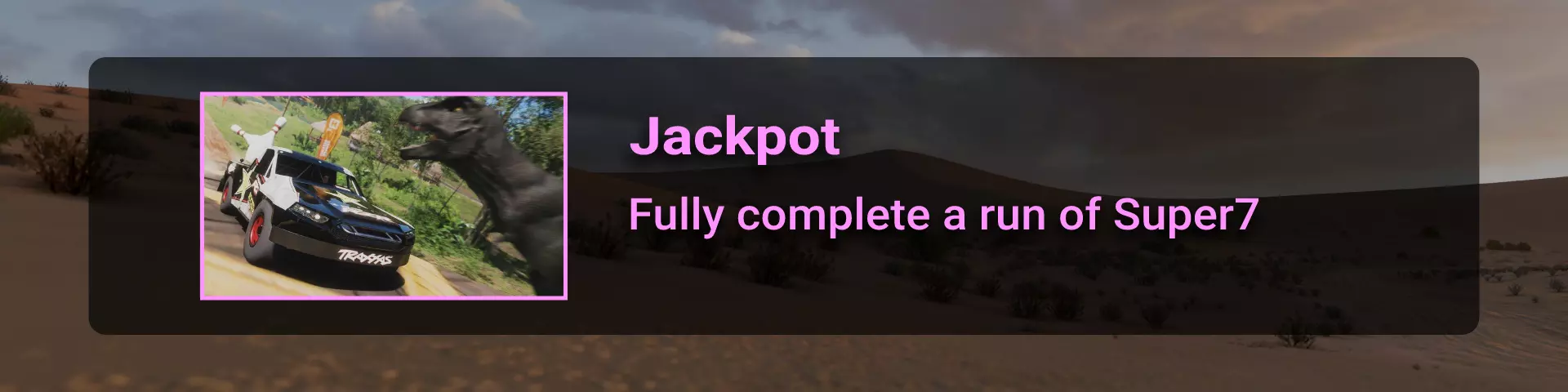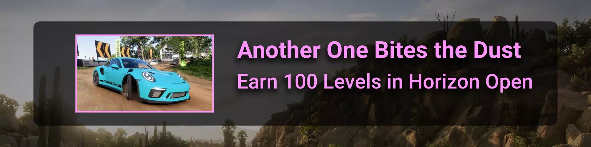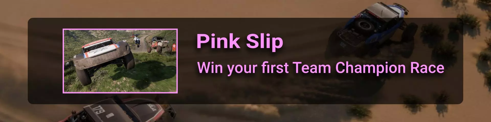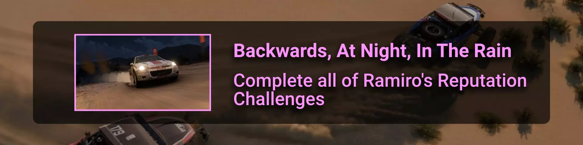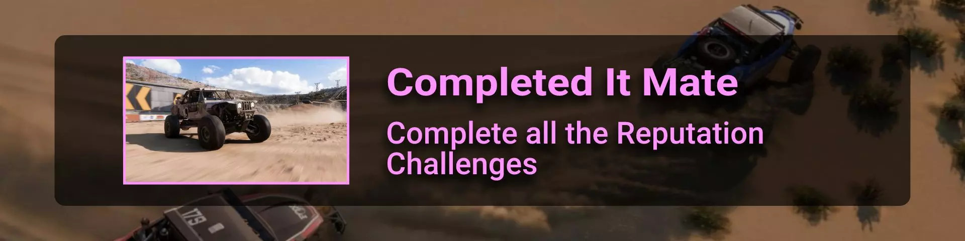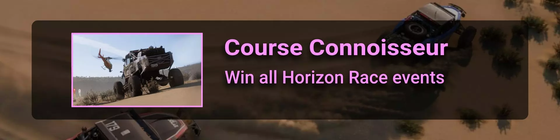 在本节中,我将介绍《极限竞速:地平线》系列玩家在环道赛中可能遇到的问题。 如果你计划达成100%成就,那么最好立即留意其中最特别的几个:Seasoned Veteran、Min, Meet Max、Gotta Smash 'Em All。 这些成就的难点在于需要等待季节和篇章的更替。季节每周四格林尼治标准时间14:30更新,而篇章则在经历4个季节的周期后每月更新一次。 Seasoned Veteran和Min, Meet Max这两个成就如果能赶上第一个季节,可在1个月内完成。关键是要完成环道赛列表中的所有任务(详情见终点线部分)。要解锁【Gotta Smash 'Em All】成就需要一个多月的时间,因为在第一系列期间,5个任务中只能完成1个(详情见“碰撞测试”部分)。这些任务本身难度不高,只需摧毁地图上的某些物体,例如仙人掌。问题在于必须等待这些任务出现在任务列表中。希望开发者能解决这个问题,让这类任务每个赛季至少出现一次。