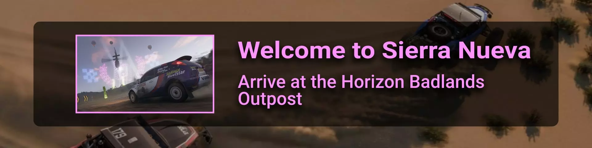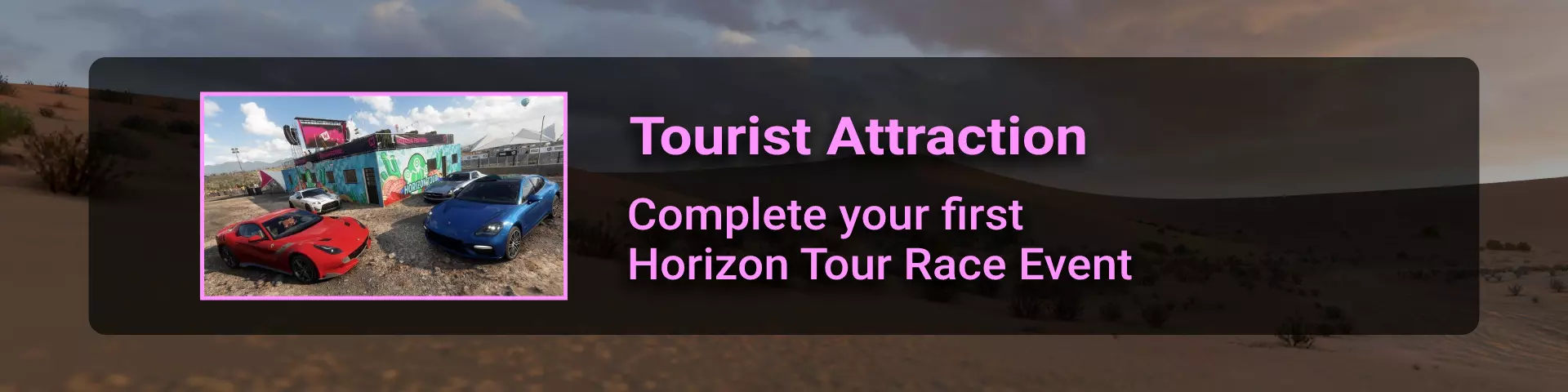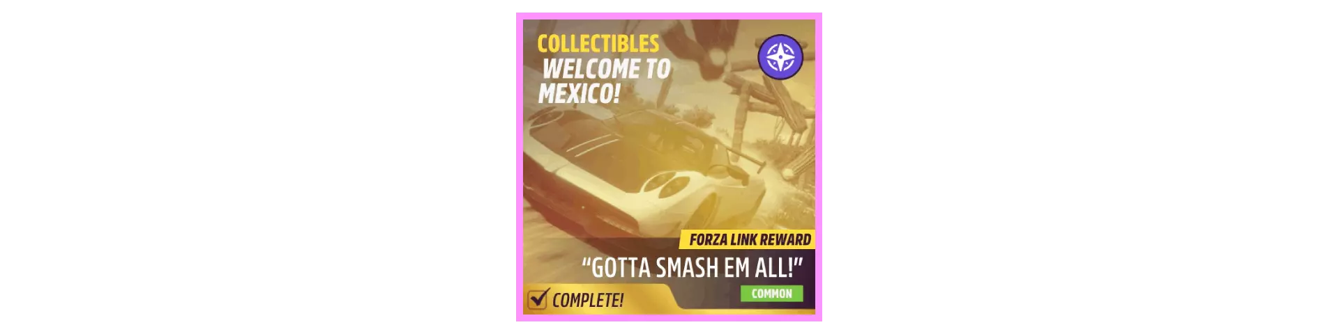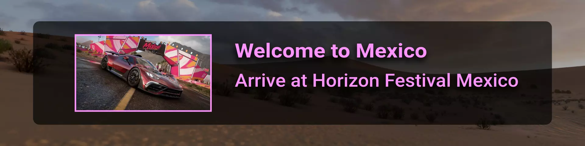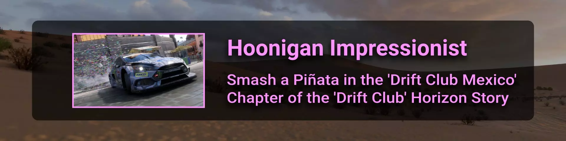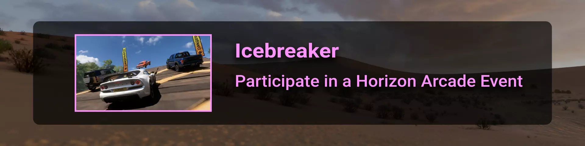 完成序章后,地平线街机活动将在墨西哥各地刷新。驾驶到这些粉色圆圈处(或直接传送),等待活动开始并参与其中。你不需要赢得活动,但尝试一下是值得的,因为你需要赢得5场活动才能解锁【Unlimited Prowess!】成就。 活动外观如下:
