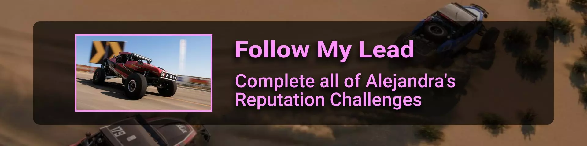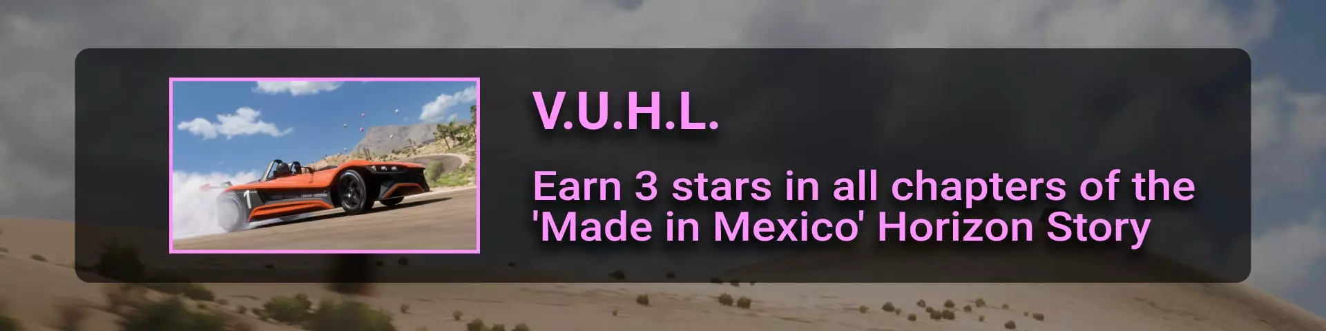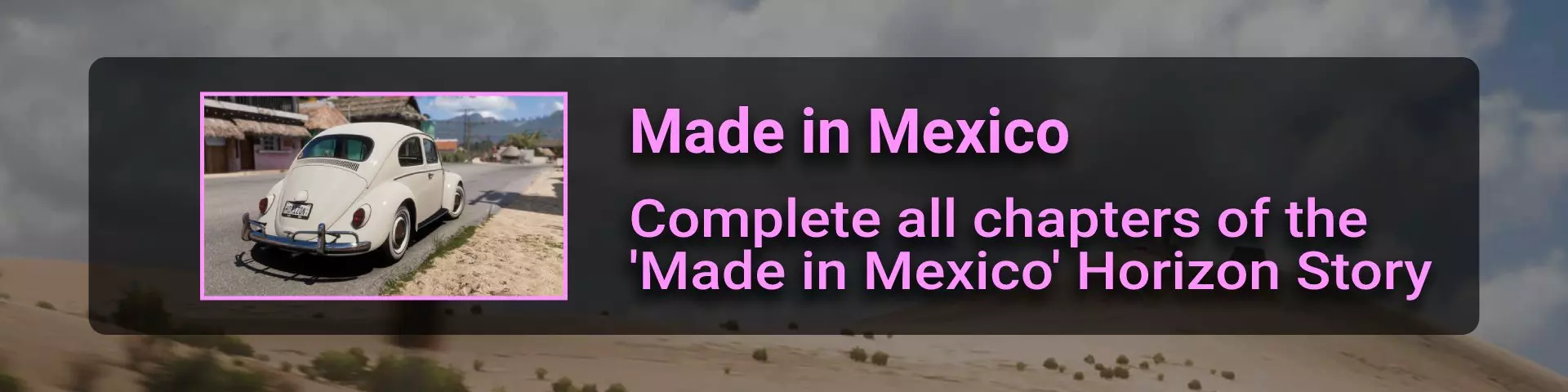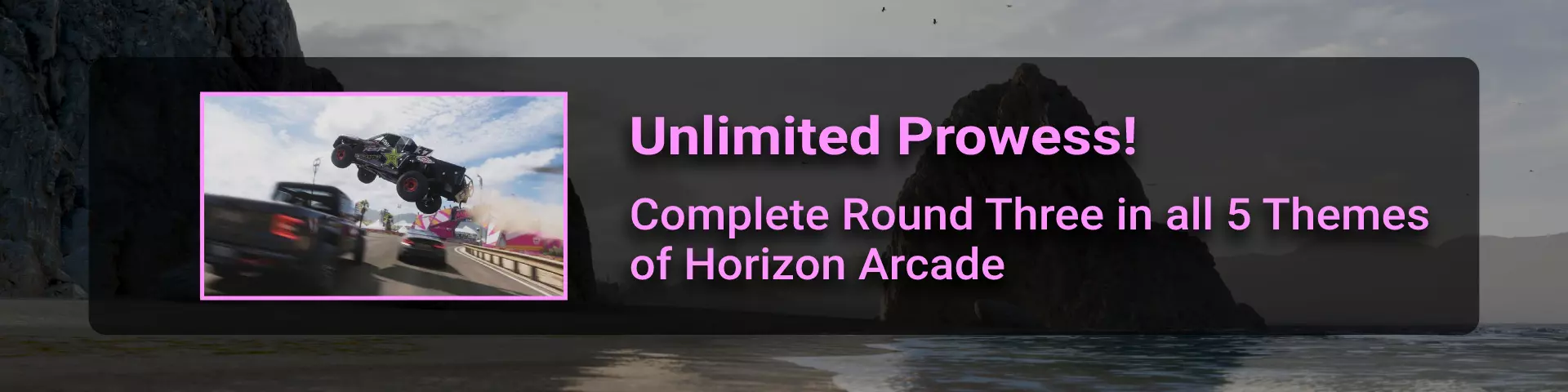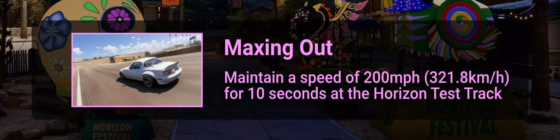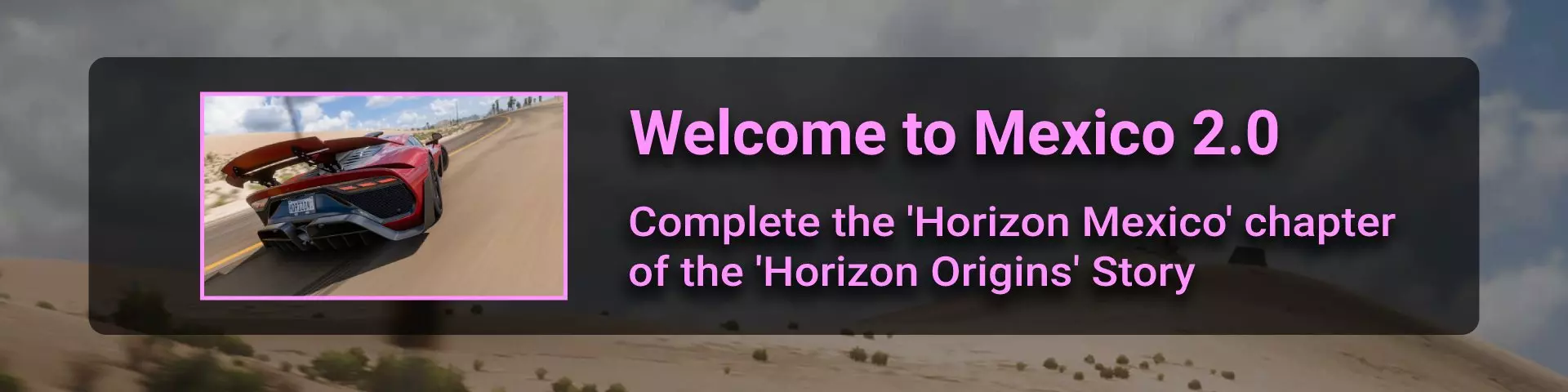完成序章后,地平线街机活动将在墨西哥各地刷新。驾驶到这些粉色圆圈处(或直接传送),等待活动开始并参与其中。你不需要赢得活动,但尝试一下是值得的,因为你需要赢得5场活动才能解锁【Unlimited Prowess!】成就。 活动外观如下:
