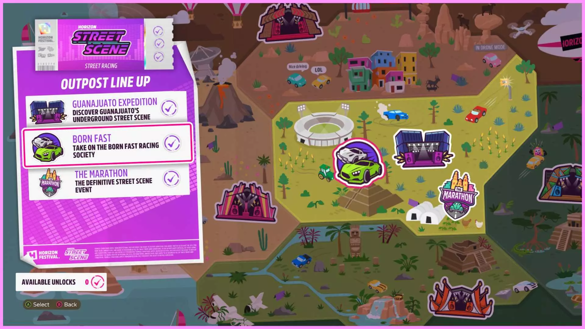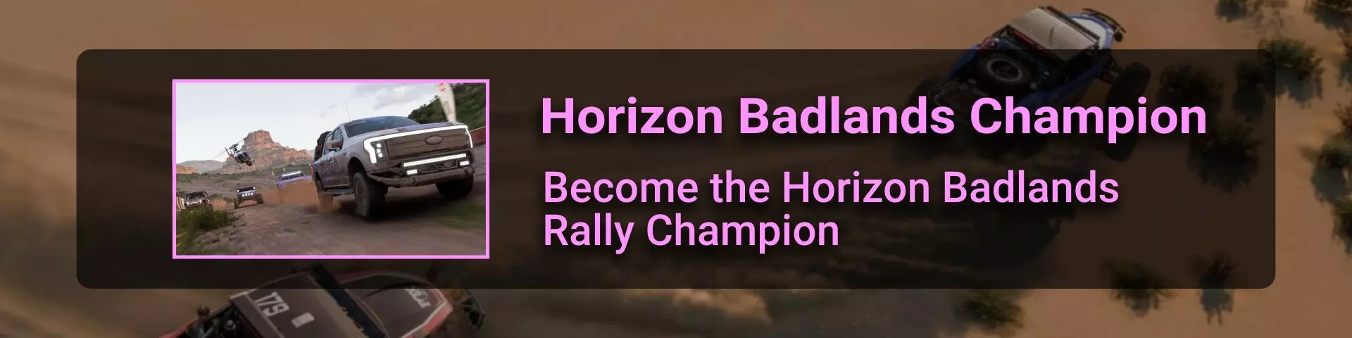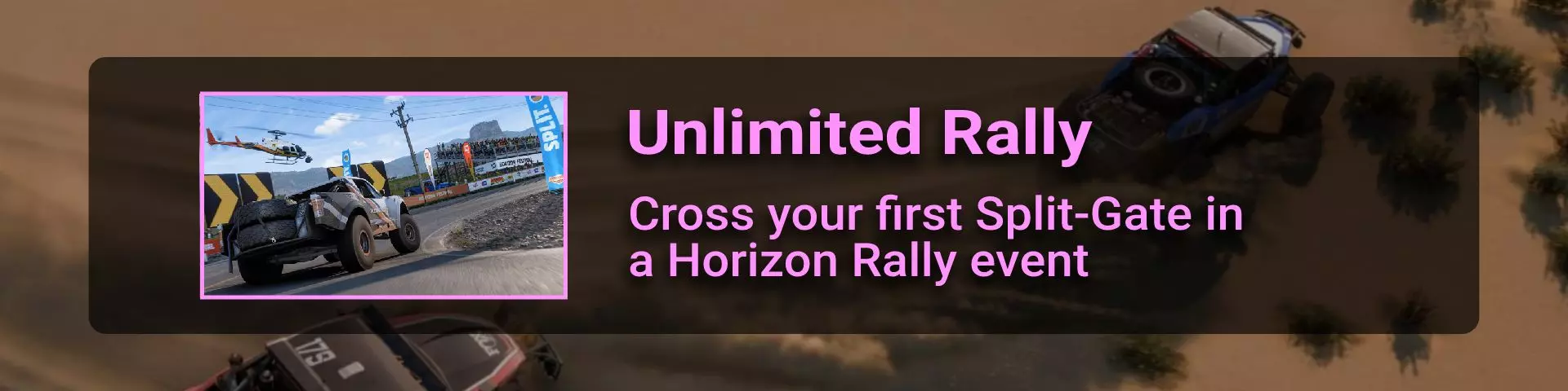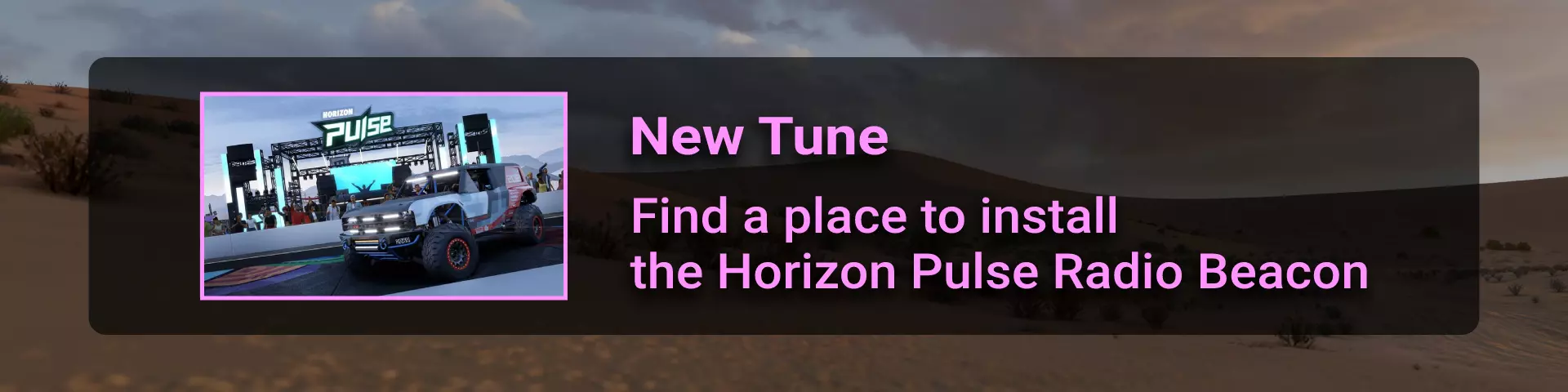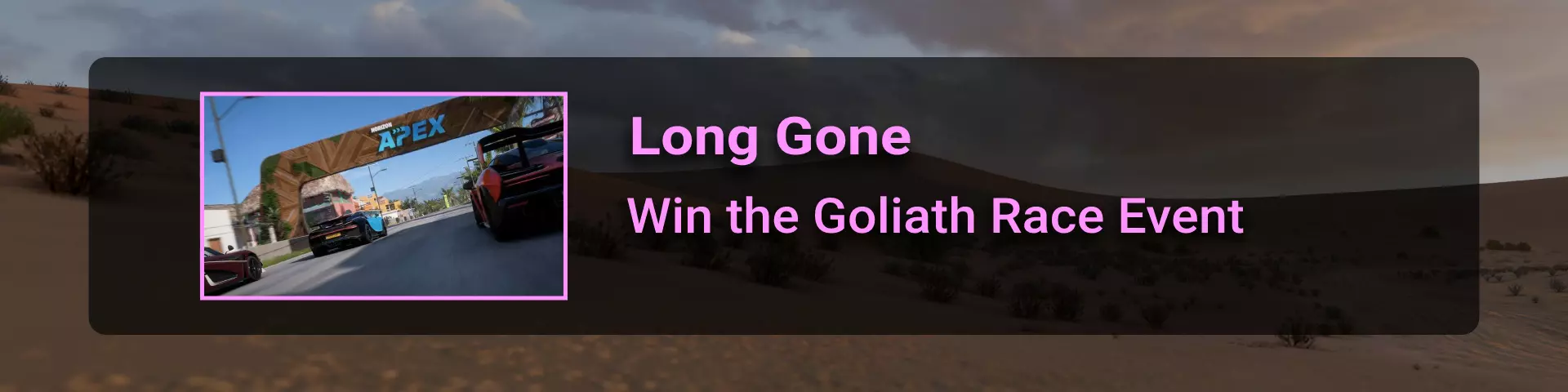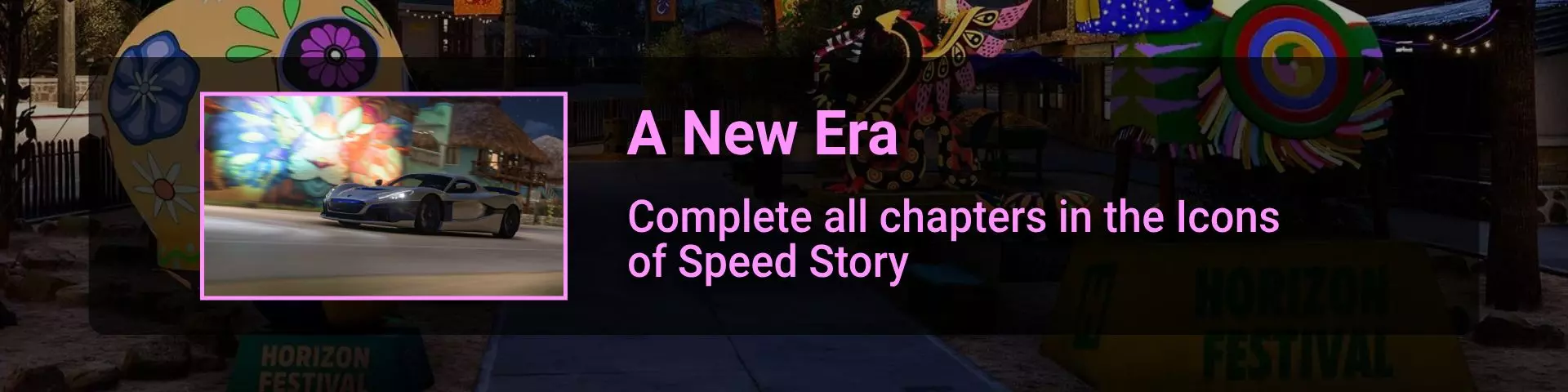 完成序章后,地平线街机活动将在墨西哥各地刷新。驾驶到这些粉色圆圈处(或直接传送),等待活动开始并参与其中。你不需要赢得活动,但尝试一下是值得的,因为你需要赢得5场活动才能解锁【Unlimited Prowess!】成就。 活动外观如下: