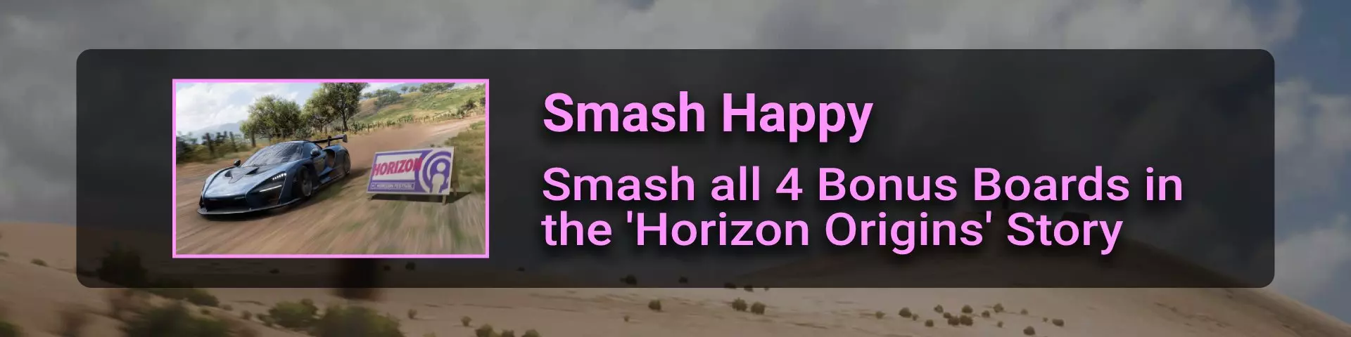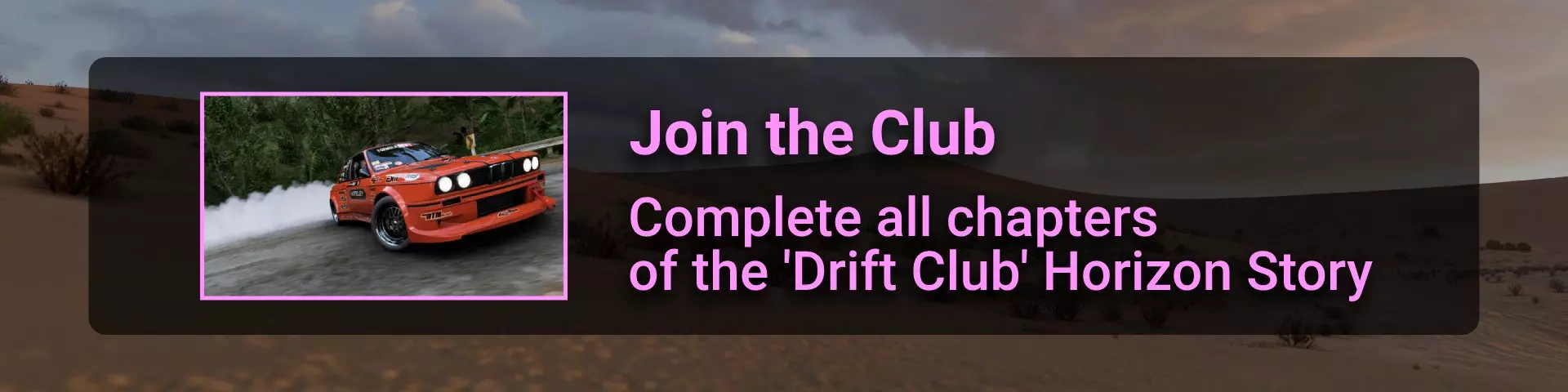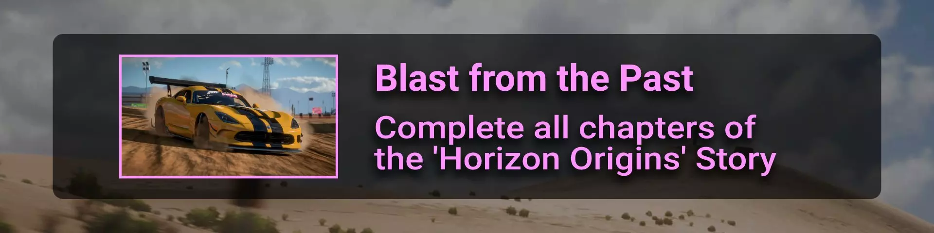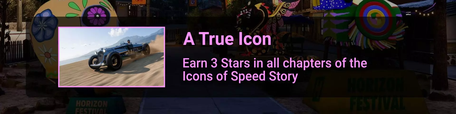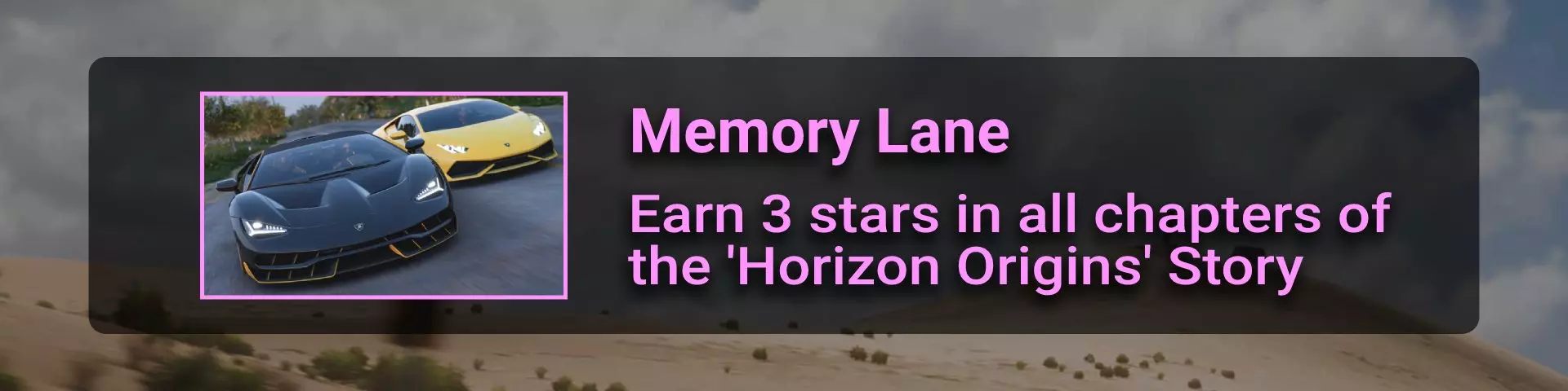 完成所有地平线冒险门票并完成解锁的所有赛事。在此过程中,你需要在许多其他赛事类型中赢得比赛,以收集足够的赞誉点数来升级并获得门票。名人堂所需的赞誉点数总数为200000。完成地平线阶段的所有目标并积累足够的赞誉点数后,你将收到邀请。 地平线故事 这是我们旅程中一个相当有趣的转折。故事包含一些关于我们经过的汽车和地点的有用信息。但主要问题在于故事内容幼稚且角色愚蠢……因此,如果你和我一样,只为了2个成就而完成一个完整的故事就继续前进,没人会指责你。遗憾的是,这并非我们旅途中最令人兴奋的部分……但你在这里不会遇到任何困难 :) 故事图标通过【地平线冒险】解锁,图标样式如下:
