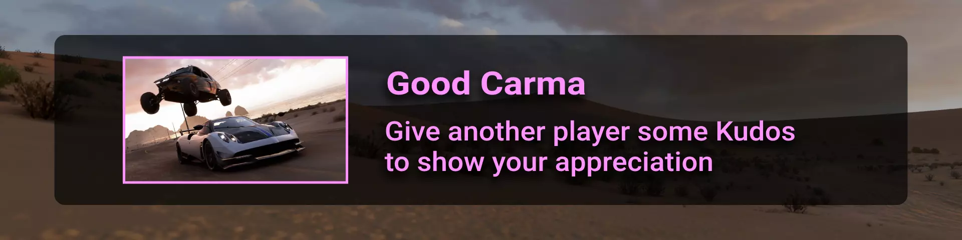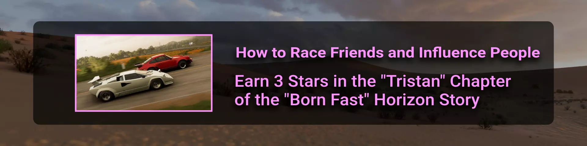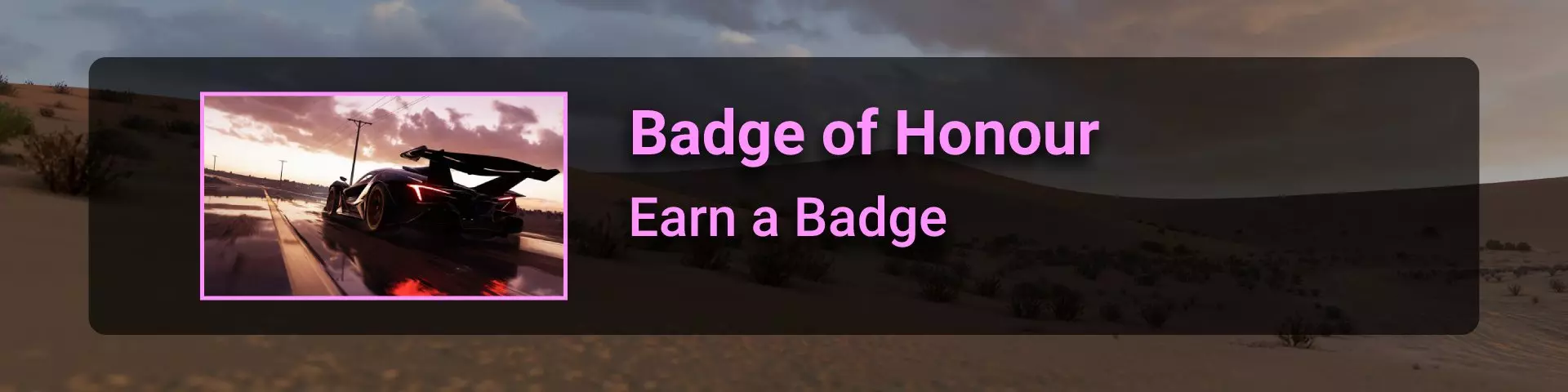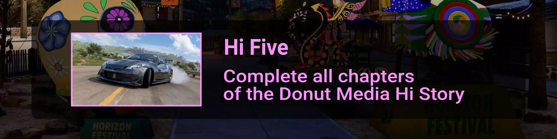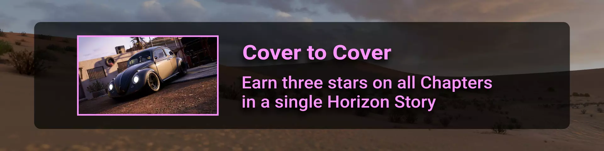 完成所有地平线冒险门票并完成解锁的所有赛事。在此过程中,你需要在许多其他赛事类型中赢得比赛,以收集足够的赞誉点数来升级并获得门票。名人堂所需的赞誉点数总数为200000。完成地平线阶段的所有目标并积累足够的赞誉点数后,你将收到邀请。 地平线故事 这是我们旅程中一个相当有趣的转折。故事包含一些关于我们经过的汽车和地点的有用信息。但主要问题在于故事内容幼稚且角色愚蠢……因此,如果你和我一样,只为了2个成就而完成一个完整的故事就继续前进,没人会指责你。遗憾的是,这并非我们旅途中最令人兴奋的部分……但你在这里不会遇到任何困难 :) 故事图标通过【地平线冒险】解锁,图标样式如下: