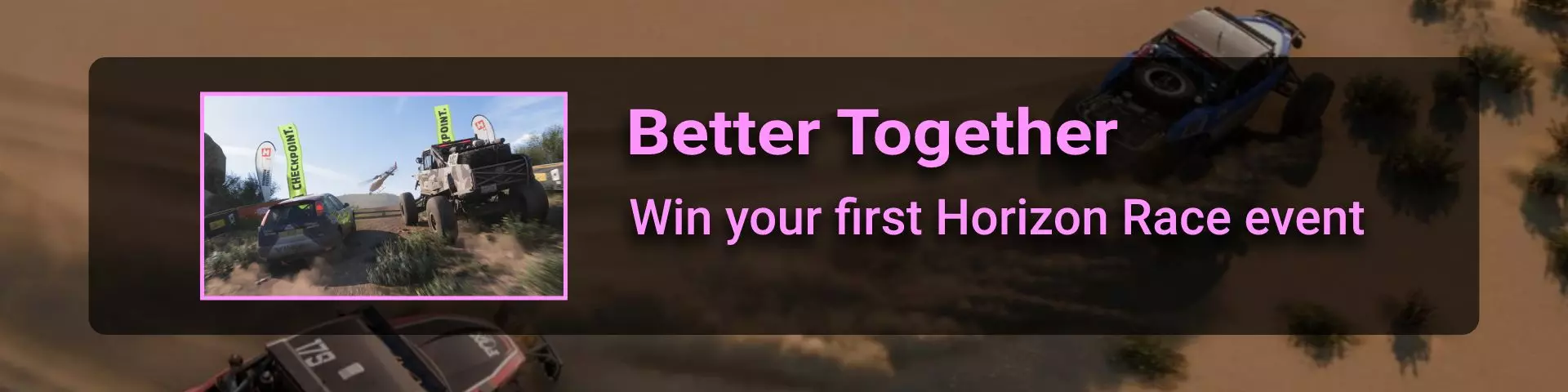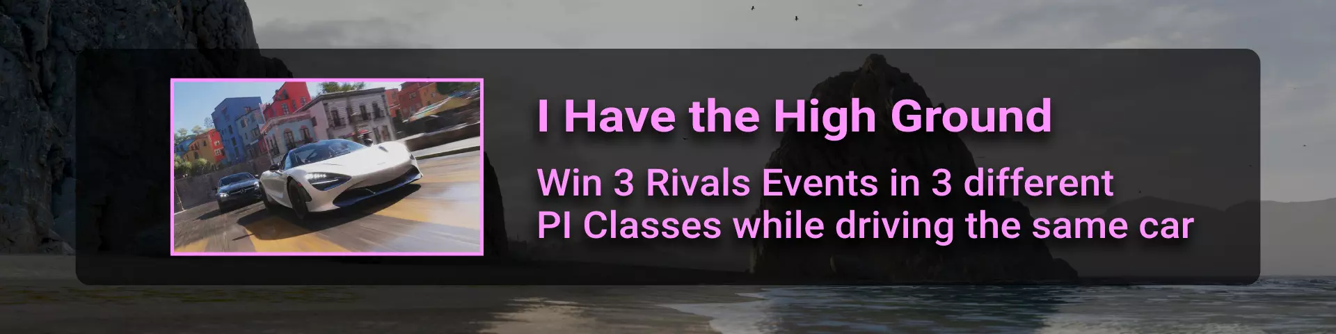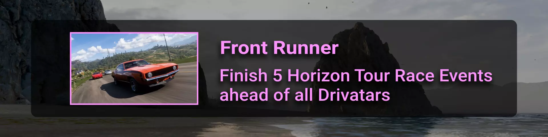 地平线巡回赛赛事是《极限竞速:地平线5》的多人游戏模式(绿色大图标)。它位于西北部的大型火山(拉格拉纳火山口)下方。完成比赛即可获得该成就。尝试超越所有电脑车手(红队)以获取Front Runner成就。 对我来说,从节日播放列表菜单启动会更容易(因为需要在每个季节完成以达成Min, Meet Max成就)。