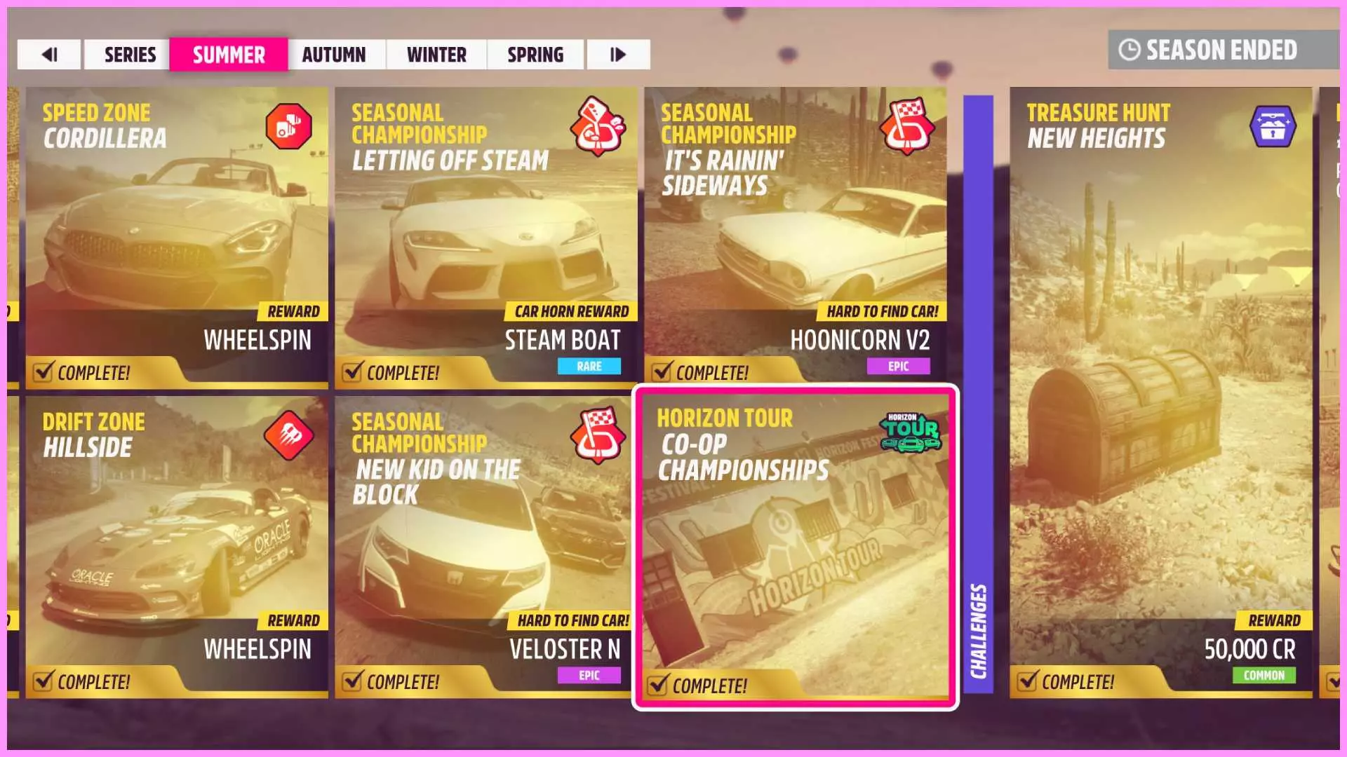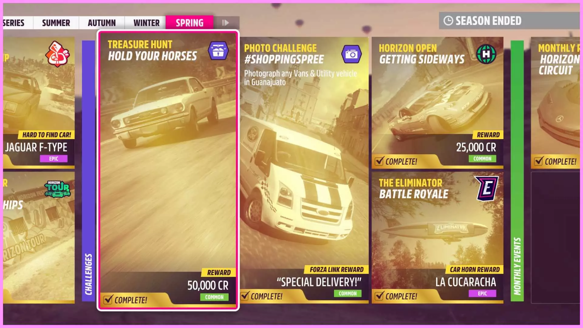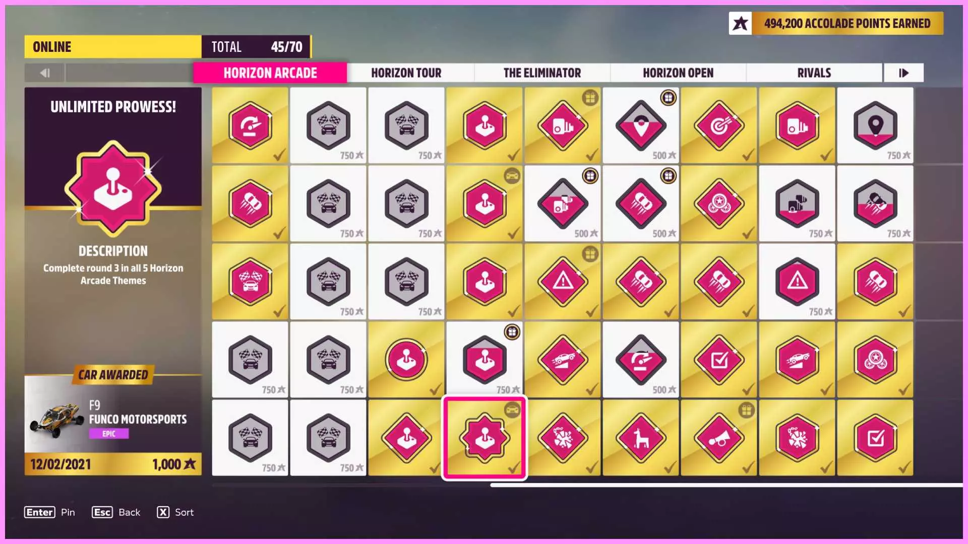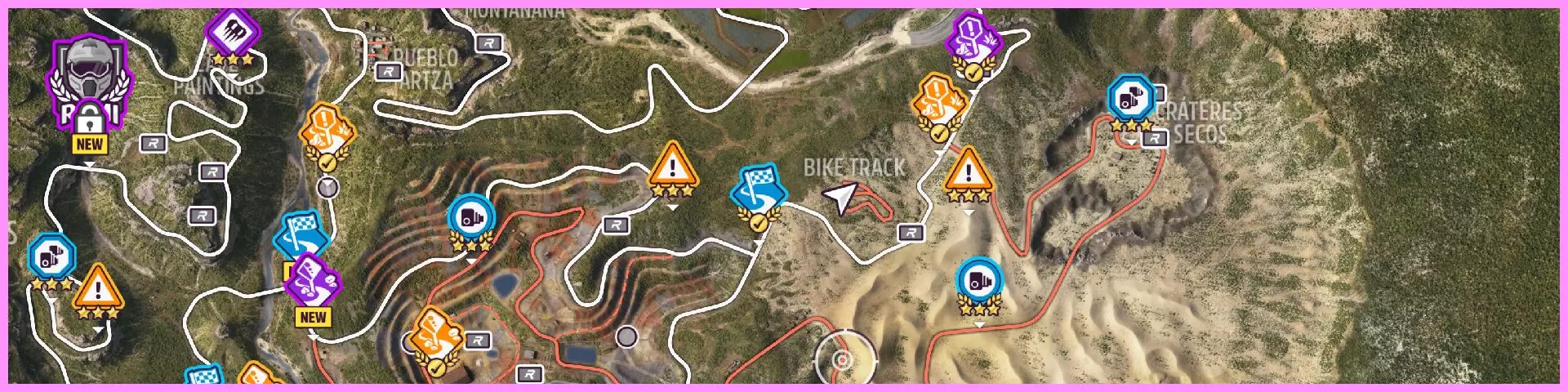 共有5种不同的竞赛类型,分别是漂移、碰撞、混乱、速度和腾空。这些名称不言自明,每种类型都对应特定驾驶技巧的展示。 你可以通过留意粉色圆圈中央下方的文字或悬停在圆圈上,来查看当前正在进行的竞赛类型。要解锁此成就,你只需在每种竞赛类型中完成第三轮比赛。在10分钟内赢得3轮比赛即可。记得记录自己已完成的赛事,你可以通过查看【无限精通】挑战(菜单-荣誉-在线-地平线街机)来追踪进度。