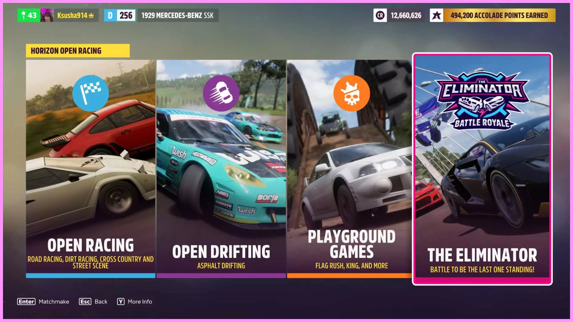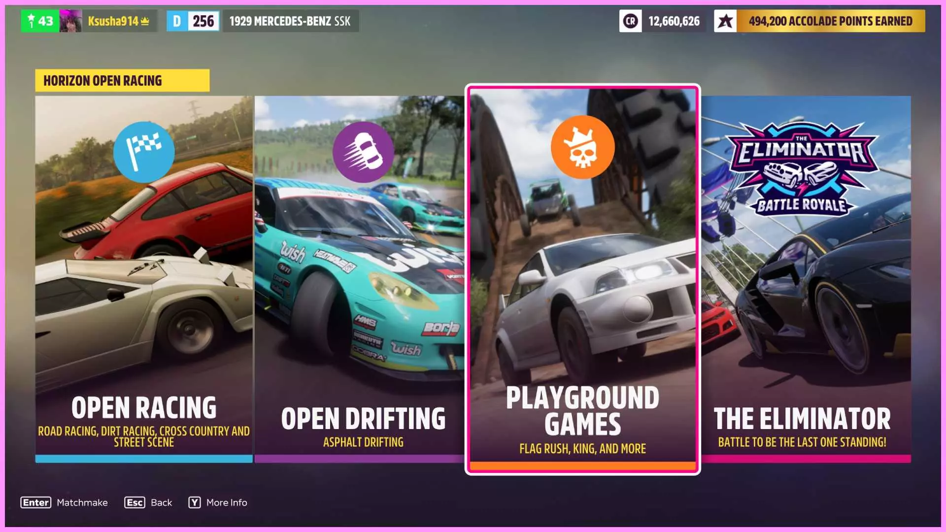如果你点击开始并进入在线标签页,中间的大按钮会带你进入地平线公开赛页面,该页面包含4个活动: - 开放竞速 - 开放漂移 - 游乐场游戏 - 淘汰之王