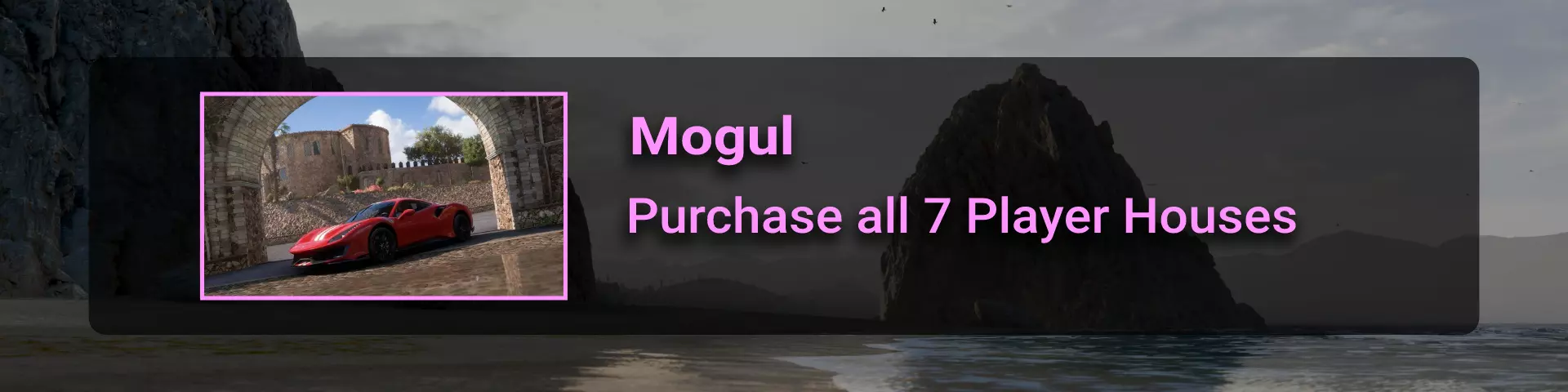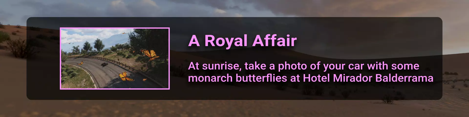 【相册】 在本部分中,我们将拍摄汽车、景点和天气状况。 要能够为地平线宣传片拍摄照片,你需要购买卢加尔·特兰基洛住宅。这所房子位于地图东侧的海滩上。如果你拥有欢迎包DLC,可免费获得该房屋,否则需花费700,000游戏币。要进入该住宅,需通过完成地平线冒险中的图卢姆探险来建造地平线顶点前哨站。 图卢姆探险: