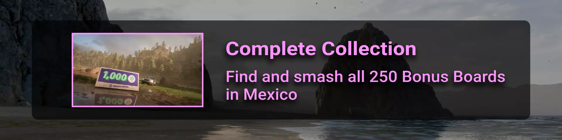 墨西哥共有578条道路。你必须完整行驶所有道路,它们才会被记录为已完成,进而解锁该成就。这其实并非最难的成就,如果你正在完成【80场不同比赛】成就,那么在着手完成这个成就时,你可能已经完成了其中的大部分道路。但如果还没有,那就打开地图,隐藏其他所有图标,查看还需要行驶哪些道路。基本上,你需要将所有道路都变为白色或红色:主干道需变为白色,支路需变为红色。同时要留意那些容易被忽略的小路(就像《极限竞速:地平线4》中的情况一样)。关于一些容易错过的地点,可以试试这里: - 位于Dunas Blancas中字母D的左侧(墨西哥西部的沙漠) - 位于Cordillera中字母C的南部(地图中央位置) 更多肾上腺素! 你喜欢上一阶段的极限体验了吧?我们还有几个疯狂的挑战需要完成,因为真正的赛车手永不停歇!运用之前学到的技能,接下来的成就很快就会解锁。 水上表现