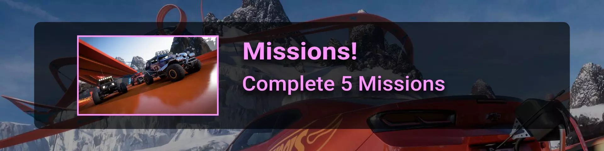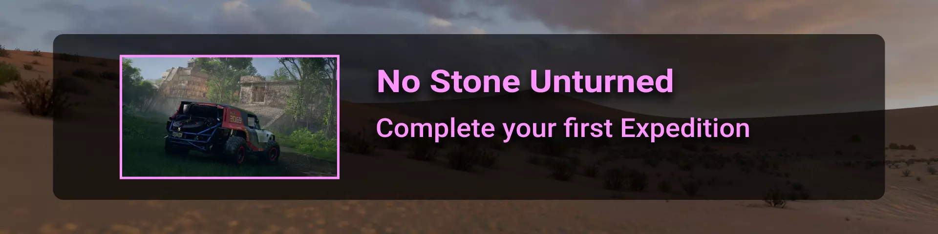 共有5个探险任务,每个对应冒险页面上的一个前哨站,完成每个探险任务可解锁新的竞赛和活动: 地平线巅峰 - 图卢姆探险,解锁公路赛 地平线荒野 - 丛林探险,解锁泥地赛 地平线巴哈 - 巴哈探险,解锁越野赛 地平线冲刺 - 峡谷探险,解锁性能特技赛 地平线街头赛 - 瓜纳华托探险,解锁街头赛 每个探险任务都会解锁一个与其类型匹配的前哨站以及该前哨站相关的活动。 No Stone Unturned