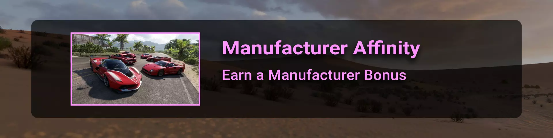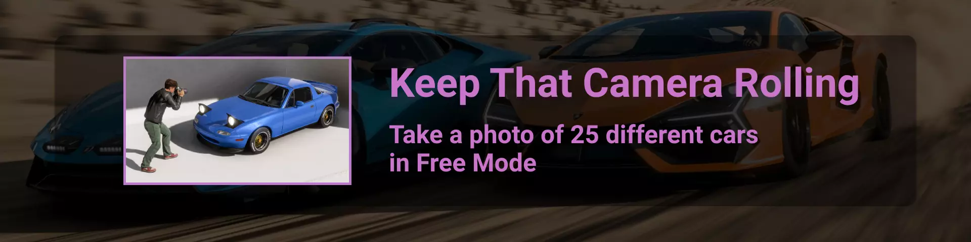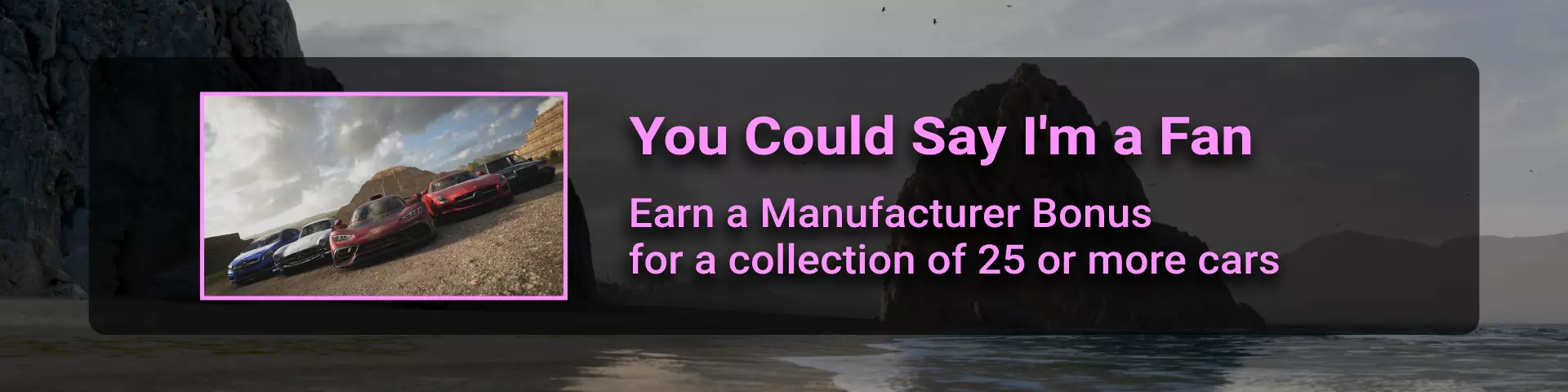 记得使用快速拍摄模式(键盘上的“P”键,手柄上的“RB”或“R1”键)来节省时间。 你也可以通过蓝图尝试:进入菜单 > 创意中心 > 地平线超级7 > 挑战卡片 > 搜索 > 分享代码,然后输入以下代码之一:169910983 或 604786984。不要忘记更改车辆等级。 【车辆收集】 要解锁成就“You Could Say I'm a Fan”,我们需要收集至少25辆同一制造商的车辆。目前游戏中有553辆汽车。你可以通过菜单:车辆 > 车辆收藏来查看你的车辆收藏。你可以直接从车辆收藏中购买车辆,只需将鼠标悬停在车辆上时按下购买按钮(Xbox手柄和键盘上为Y键),当然前提是你有足够的资金。 获取车辆的方式有以下几种: - 从汽车展或拍卖行购买