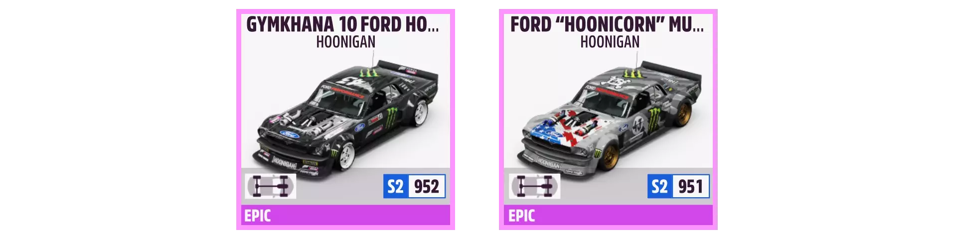 HOONIGAN GYMKHANA 10 福特 HOONICORN 野马可通过拍卖行购买或通过播放列表活动获得奖励。可用倍数为8倍。 HOONIGAN 福特“HOONICORN”野马可在车展购买(500,000游戏币)、通过幸运轮盘赢得或通过拍卖行获得。可用倍数为7倍。