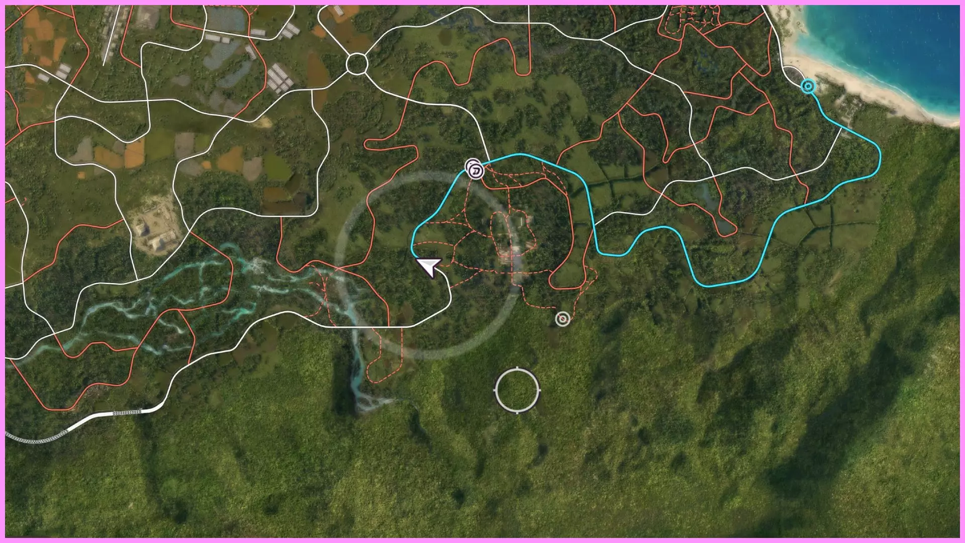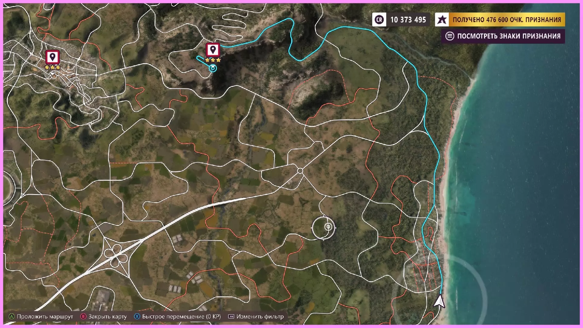 几点注意事项:不要使用快速旅行,这会重置进度,你必须开车前往,所以设置一个标记点然后沿着海岸行驶(佩特雷亚门位于右上角,就在米拉多·巴尔德拉马酒店和“淘汰者”标志的左侧)。另一个注意点:你可以使用倒带功能,当然,但倒带时计时器仍在继续,所以要注意这一点。 至于佩特雷亚门赛道,其实没那么可怕。你需要在大门计时器显示至少25秒时出发。从悬崖上跳下去,然后按照截图中的路线沿着道路行驶,接着左转并小心地在岩石之间穿行。