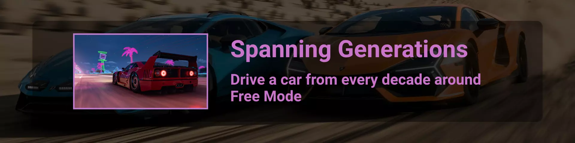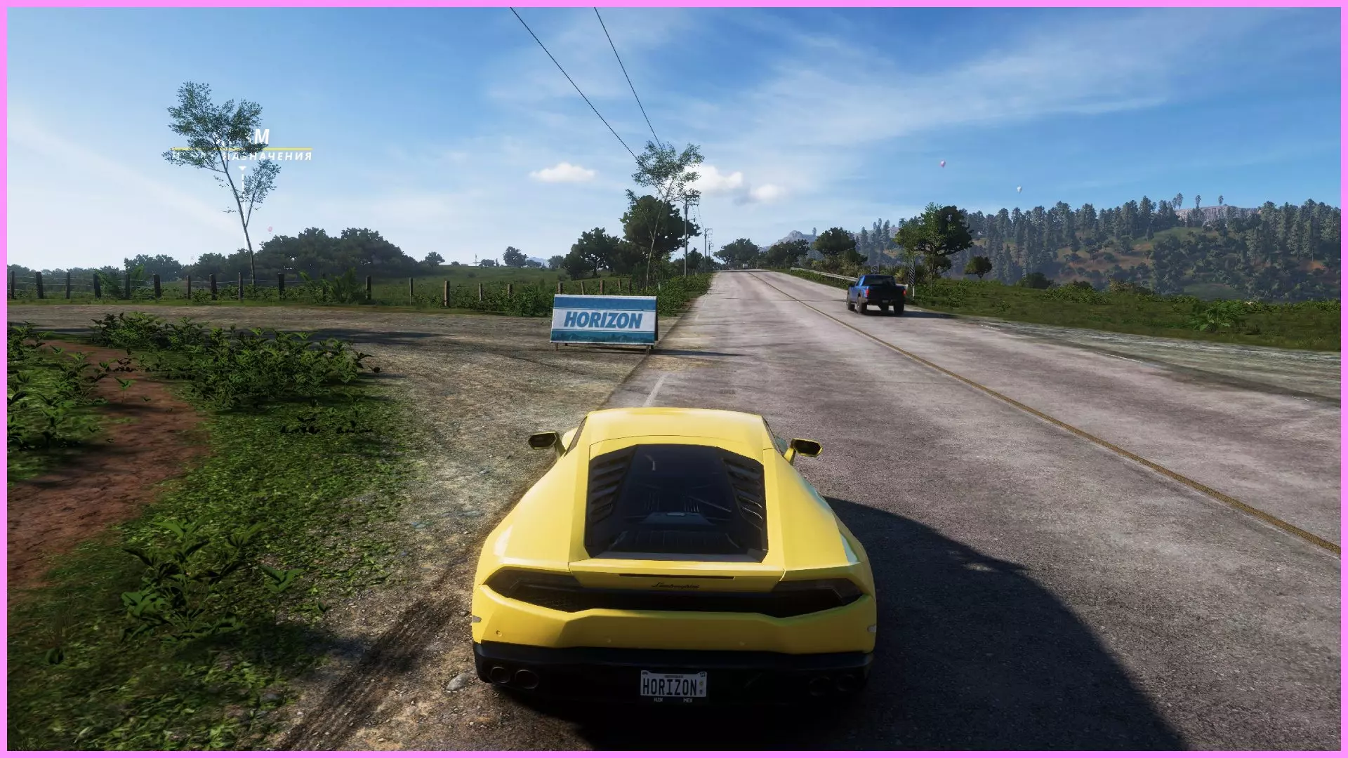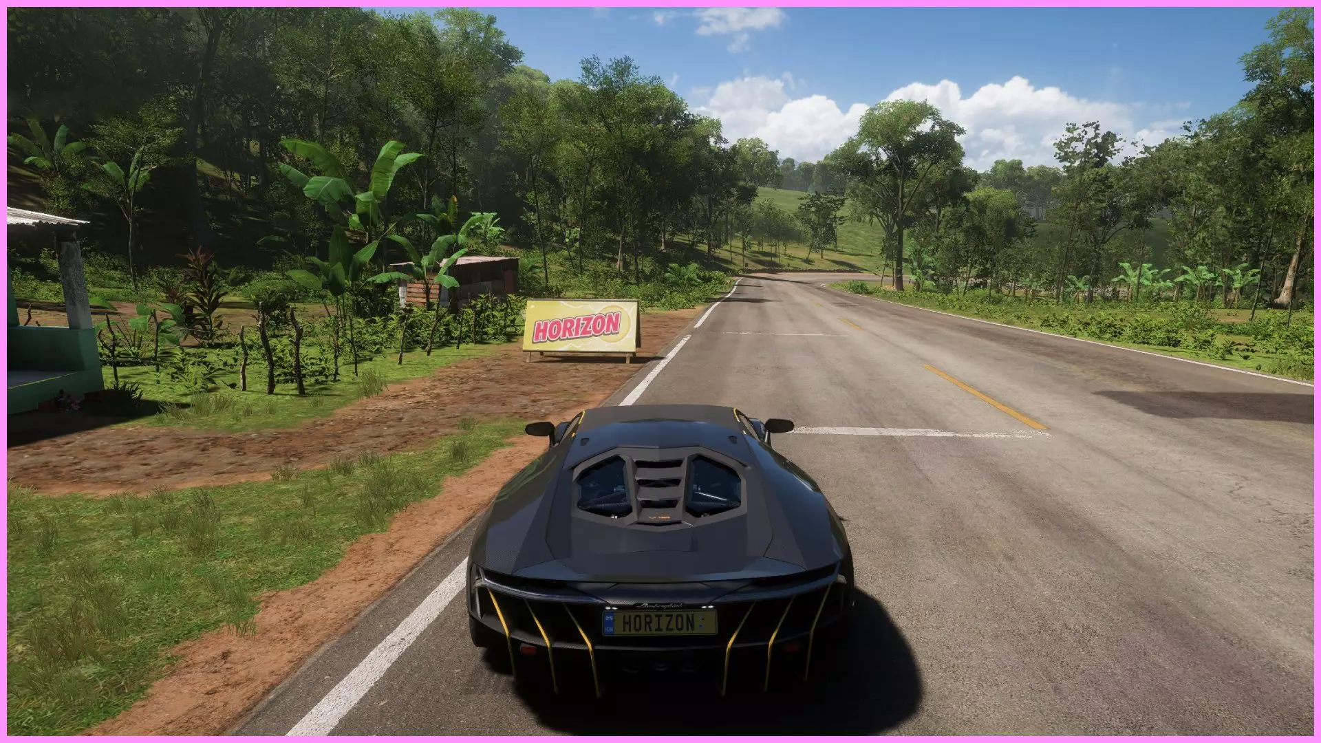 第三章:地平线目标 在本章中你只能使用一辆车,即兰博基尼Huracán。开始比赛并按照指示的路线行驶。当你距离终点约3.3英里时(在第一个长弯道后不久),会在左手边发现这个看板。