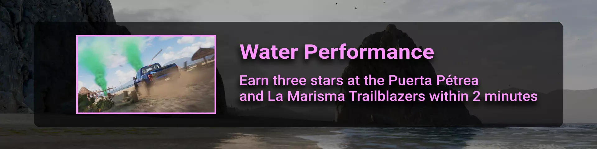 这里的描述可能有些令人困惑。实际上,你可以忽略整个“2分钟”的部分,而是应该前往荣誉菜单中的“水上表演”挑战,并固定相应的任务。要解锁固定此任务的权限,你需要完成一个(或两个)开拓者挑战(可能需要获得3星)。