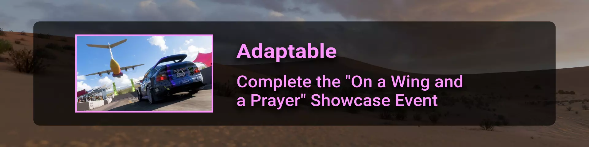 “展翅高飞”展示活动是第二个目标,紧随初始驾驶和介绍性过场动画之后。你需要驾车前往指定地点,与一架货运飞机以及两名身着翼装、驾驶 dirt bikes(越野摩托车)的 NPC 进行比赛。 投身竞赛