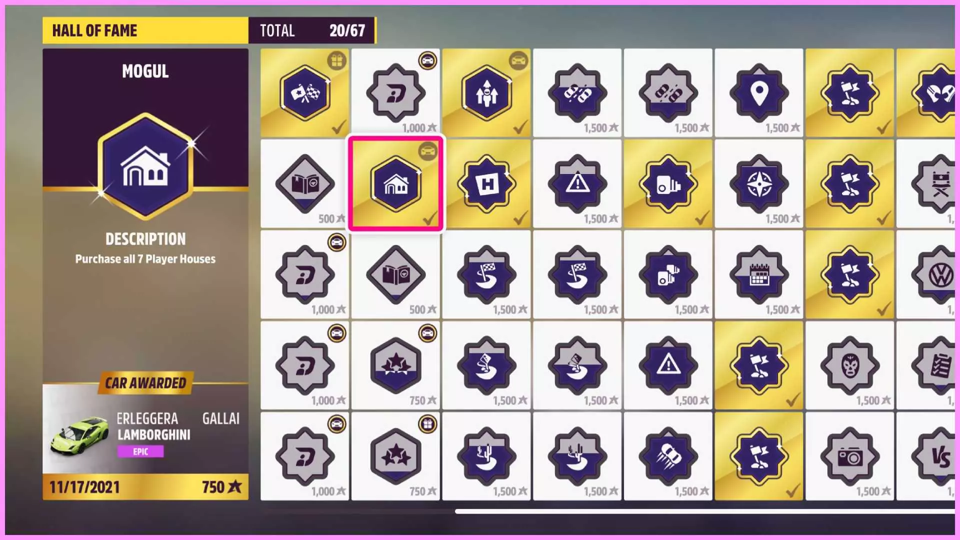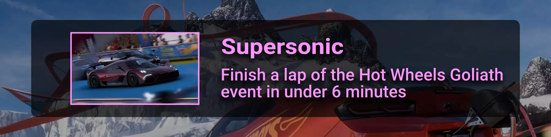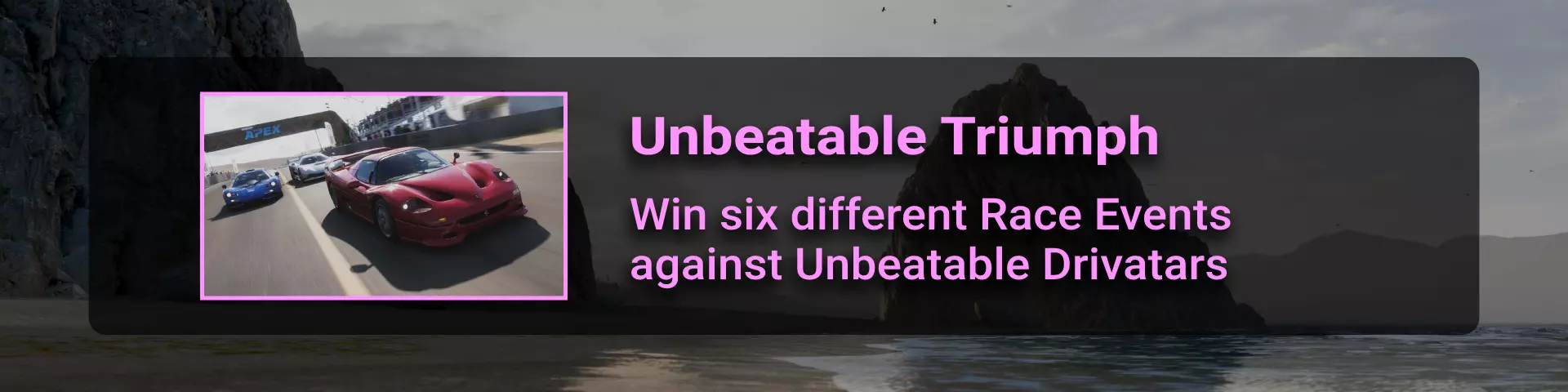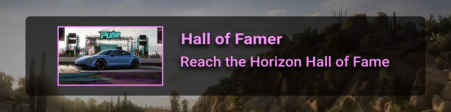 【巨人赛】是【地平线冒险】地图【主舞台】标签下第四个可获取荣誉点数的赛事。赢得该赛事即可解锁此成就。请记住,这是游戏中最长的比赛之一,所以如果发现自己落后,不要犹豫使用倒带功能,因为我们必须获胜才能获得此成就。 注意,你必须完成标准的主线【巨人赛】赛事,而非【活动实验室】赛事,因为【活动实验室】的比赛不计入成就解锁条件。驾驶保时捷Taycan Turbo S完成比赛需要14分46秒。因此,驾驶X999级别的布加迪或Jesko,比赛时间应该会更短。确保将难度设置得比平时低,以避免失败和重复比赛。 Hall of Famer