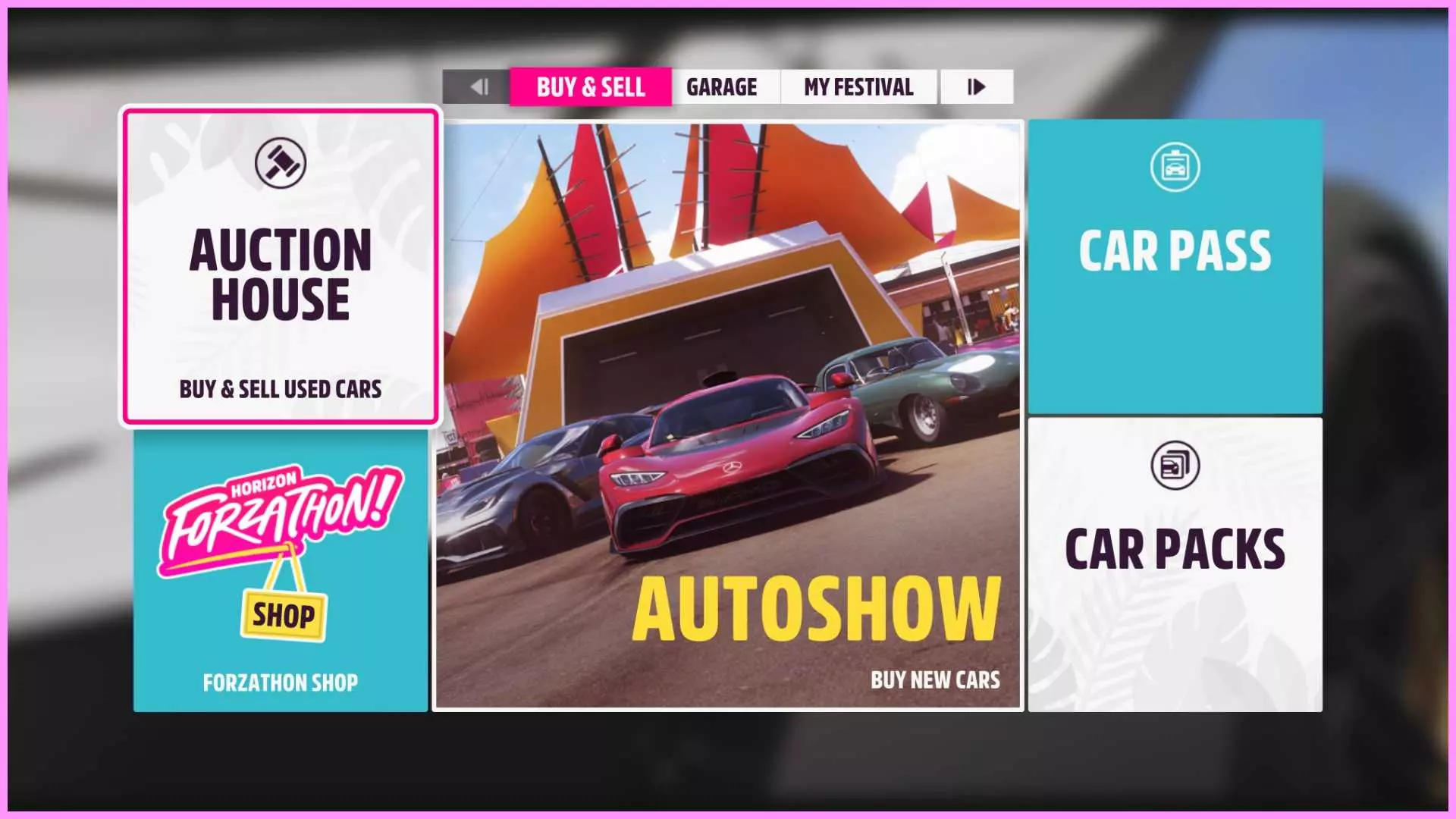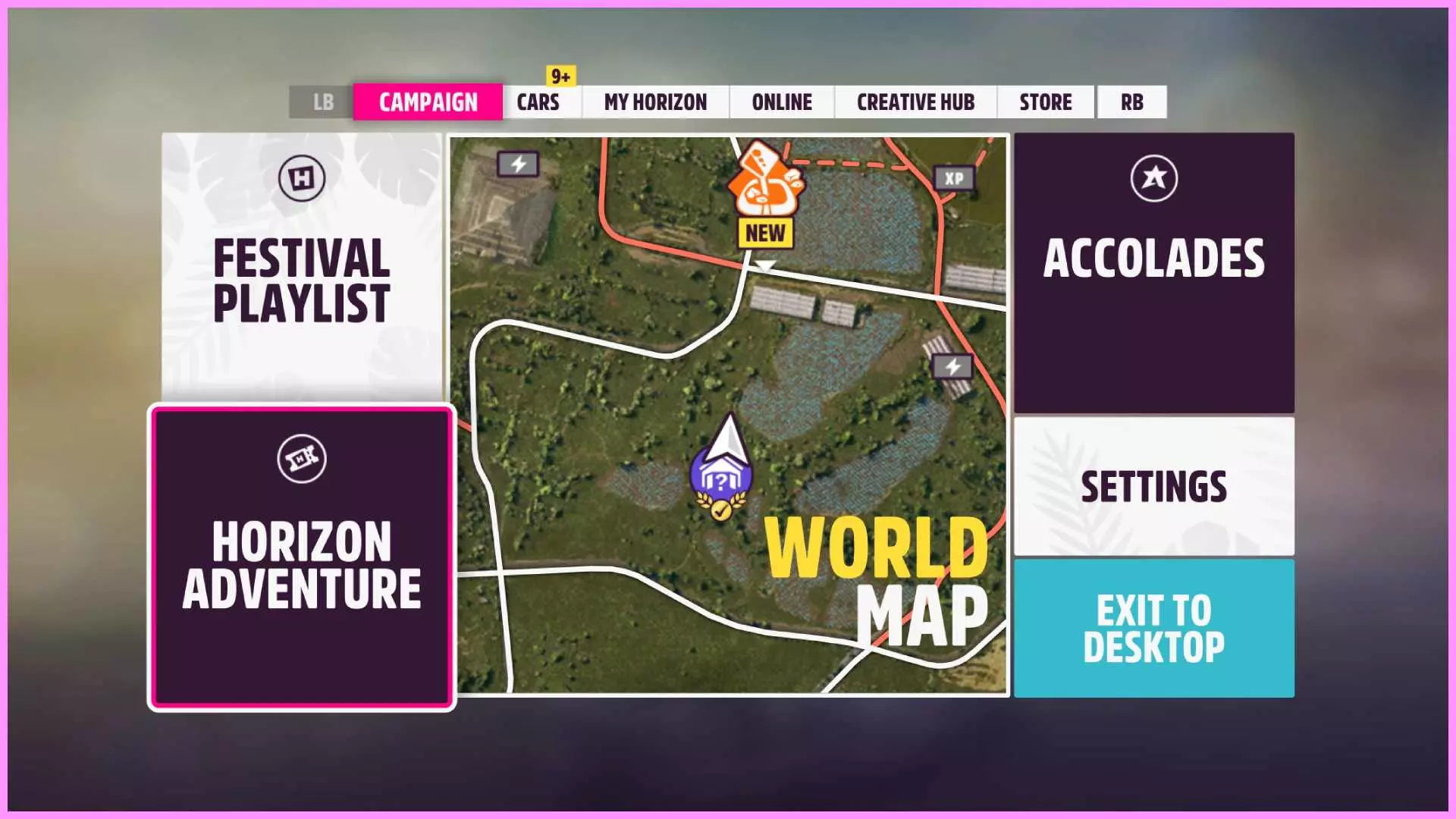 从《极限竞速:地平线5》车展购买任意一辆车。你可以通过菜单、访问车展或打开车辆收藏来完成。更多详情可在【车辆收藏】部分查看。 ✦ 地平线冒险 恭喜,你现在已成为墨西哥地平线嘉年华的一员!是时候赚取声望,证明自己有资格成为名人堂明星了!不过不用着急,还有很多东西需要学习。 让我们从《极限竞速:地平线5》的主要更新内容【探险】开始,这是一种以探索和故事为驱动的活动。 打开【地平线冒险】标签页:
