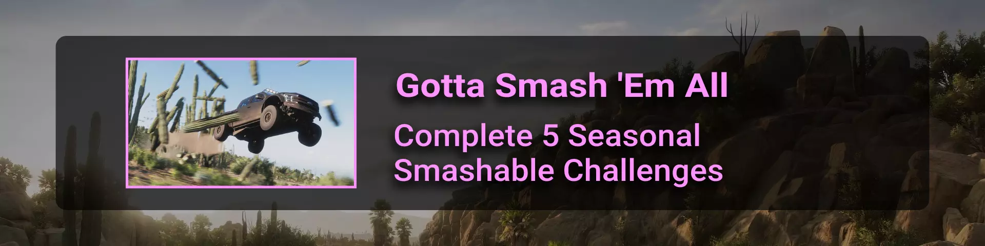可粉碎挑战显示在节日播放列表菜单右侧的【挑战】分类中。 在系列1中,夏季赛季有一个可粉碎挑战。标题为【收藏品】,要求粉碎100个仙人掌(在冲击粉碎500个仙人掌成就的过程中完成此挑战是个不错的选择)。 每日挑战可能不计入(系列0曾有一个可粉碎每日挑战,但未计入成就追踪器)。 根据每日挑战是否计入,解锁此成就可能需要数月时间。