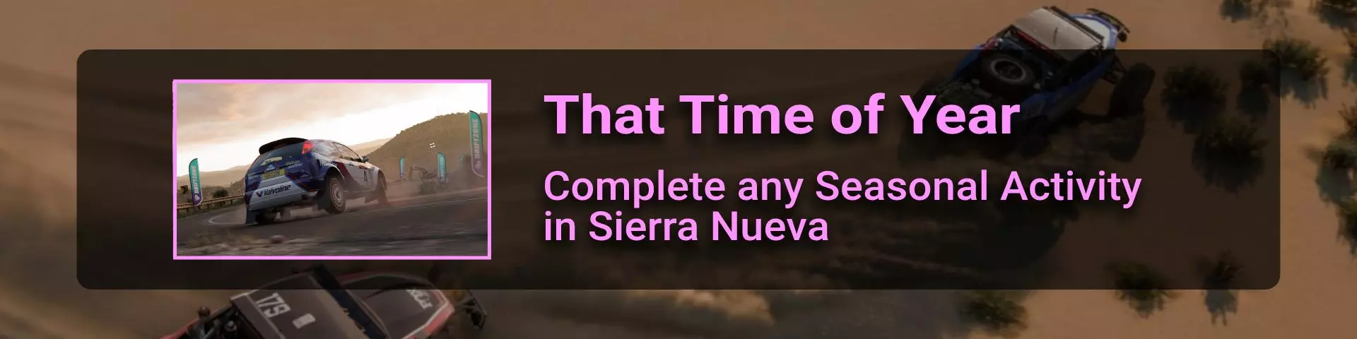 我通过完成塞拉新瓦地图的每日挑战获得了这个成就。但当时该地图上没有特殊的拉力冒险赛季挑战。所以现在可能无法通过每日挑战完成。无论如何,你可以先尝试每日挑战,如果你在塞拉新瓦看到容易完成的内容,或者直接去完成像这样的橙色/红色标记活动。