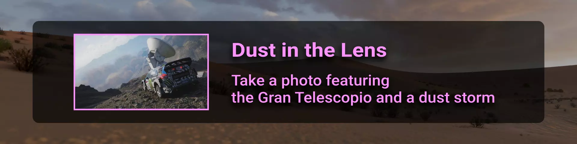 有一个让这个成就更容易完成的方法。进入菜单>创意中心>赛事实验室>赛事蓝图>搜索,输入分享代码514524330。 不过,这个方法似乎已被修复,现在只能在自由漫游模式中获取该成就。在春季赛期间,驾驶到卫星附近。一旦看到沙尘暴,直接传送至卫星处。确保在照片模式中设置默认天气。 在拍摄这张照片时解锁了成就(如果此方法无效,尝试更靠近卫星并拍摄照片)。