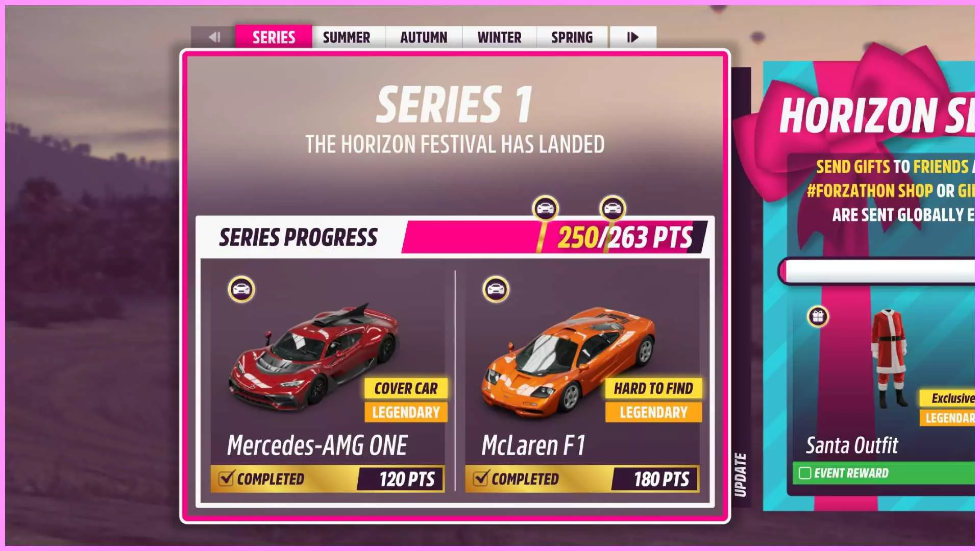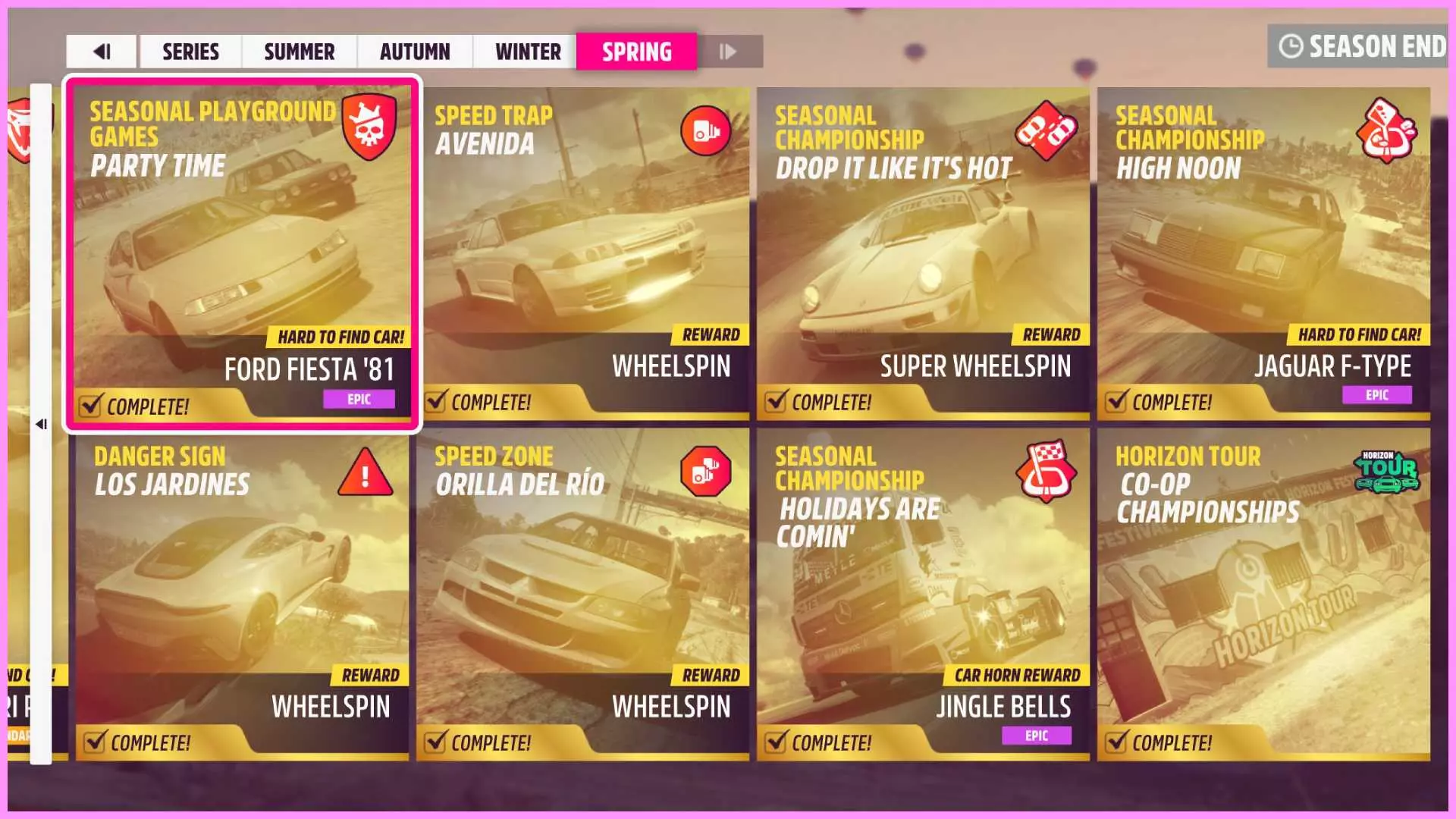 赛季每周四格林尼治标准时间14:30更新,而系列赛则在经历4个赛季的周期后每月更新一次。 在暂停菜单中可以找到节日播放列表,其中包含大量需要在赛季结束前完成的活动【赛季持续一周,每周四格林尼治标准时间14:30更新,系列赛则持续一个月】。向右滚动即可查看剩余活动,这些活动通常包括比赛、性能评分活动以及一些在线内容。完成所有活动即可解锁该成就。 你必须完成系列赛中每个赛季的所有活动,并填满系列赛标签上的进度条。