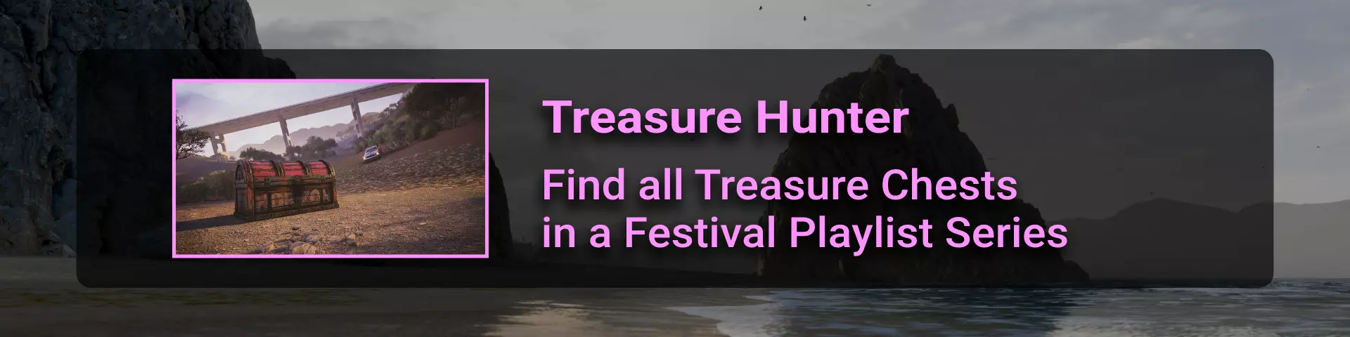 这是一个基于赛季的成就,所以请留意游戏列表中出现的【宝箱】季节性挑战。完成这些挑战,找到宝藏,这个成就就属于你了。 宝藏猎人挑战位于【节日游戏列表】菜单右侧的【挑战】中,标题为【宝藏猎人】。 在系列1中,有两个宝藏猎人挑战:第一个在夏季,第二个在春季。 找回这两个宝箱,你就能解锁该成就。 在未来的系列中,每个系列的宝藏猎人挑战数量可能会有所增减。 由于每个系列的宝藏数量不同,成就追踪器可能无法正常工作。 这是任务执行前的样子: