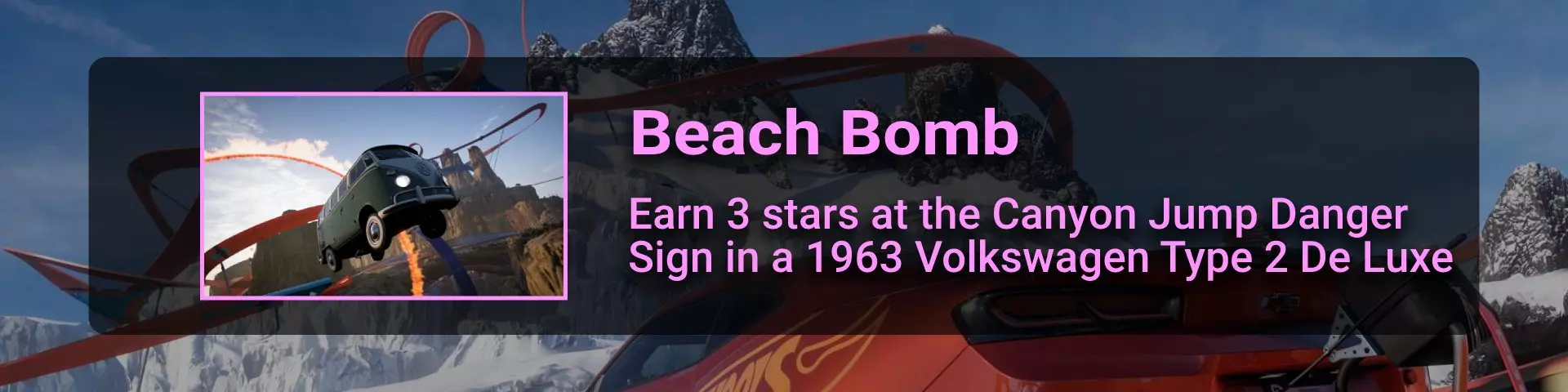 第一章:墨西哥制造 - 1分50秒内完成 第二章:巴哈越野车 - 4分钟内完成。完全切过大部分弯道并驶离公路 第三章:活力甲壳虫 - 2分30秒内完成。选择最短路线到达终点 第四章:穿越时代 - 驾驶大众Mk7高尔夫R获得50000技能点。结合碰撞和漂移 第五章和第六章:经典Mk1/强劲Mk7.5 - 1分45秒内完成。这是两场相同的比赛,唯一区别是驾驶的车辆(第五章驾驶Mk1高尔夫,第六章驾驶Mk7) 第七章:狼族生活 - 获得150000技能分 第八章:众多马力 - 2分15秒内完成 第九章:泛美越野赛 - 3分45秒内完成 【拉力冒险DLC】