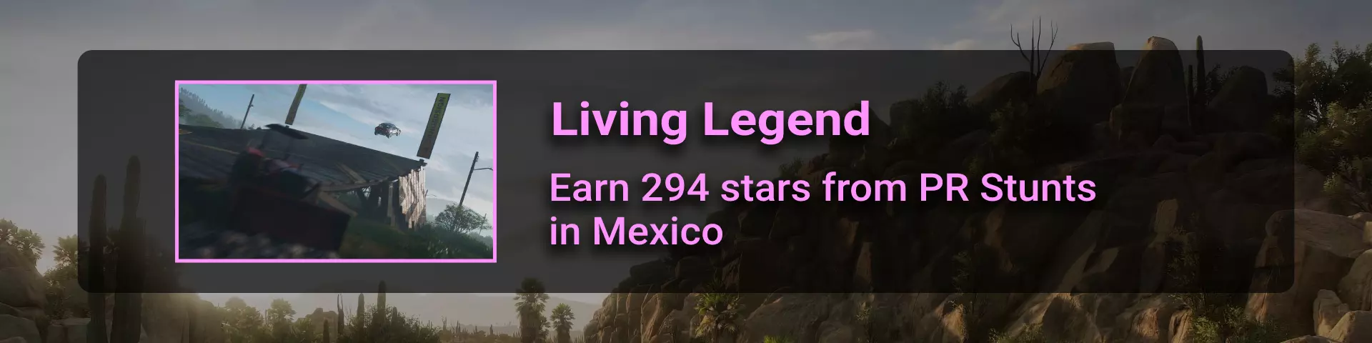✦ 无畏特技大师 ☠️ 欢迎来到我们冒险中最刺激的部分! 尽管《极限竞速:地平线》系列中没有警察,但遍布墨西哥的警用雷达会监控车手的活动!是时候向地平线社区展示谁才是真正的无畏特技大师,打破所有PR特技的记录了!驾驶最快的赛车,全速前进吧!这是我旅途中最喜欢的高速公路,希望你也会喜欢! 传奇人物