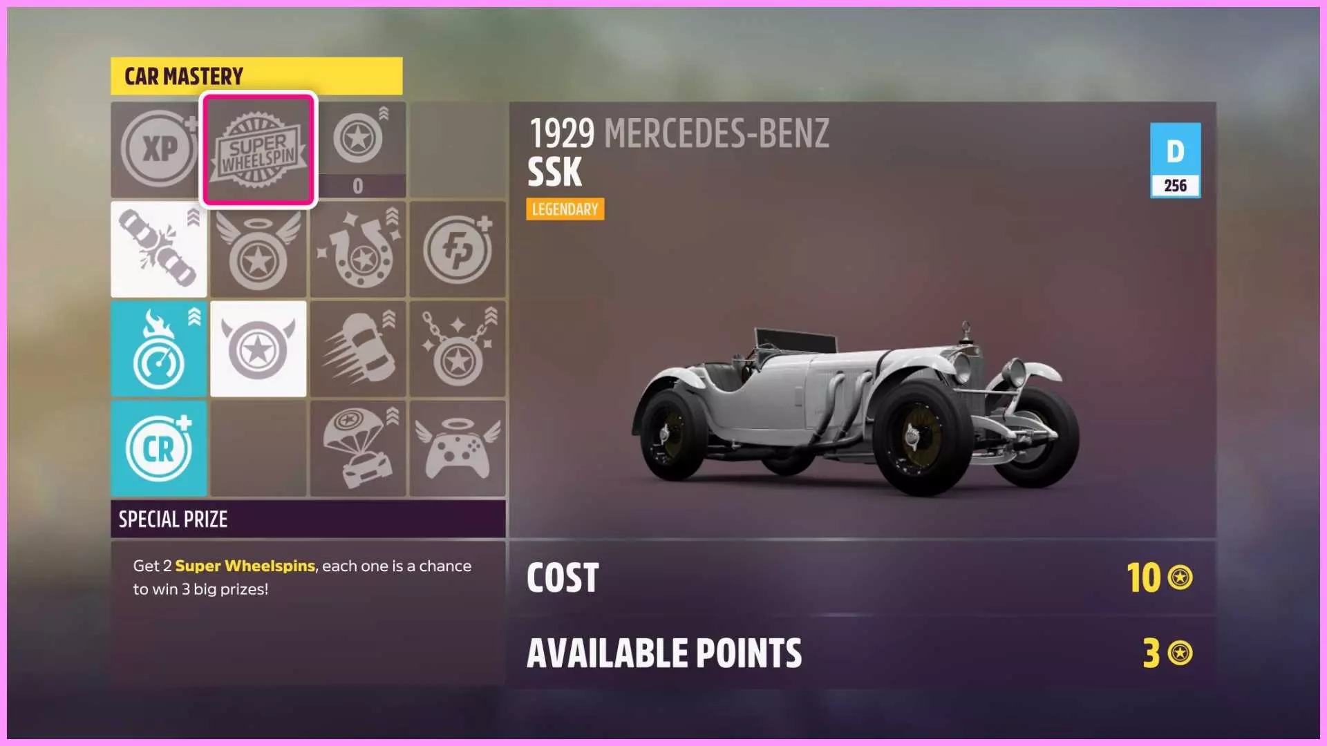这辆车可以在车展以2700000 CR购买,或者尝试在拍卖行以更低价格获得。调校车辆时确保只选择S2或更低级别,因为X999不允许用于在线比赛。 从菜单进入在线选项卡,选择地平线公开赛,然后向右滚动选择自定义赛事。选择街道类型以及与你调校相匹配的比赛级别(S2调校和级别完成速度更快)。然后加入并完成1场比赛。 Back in the Saddle