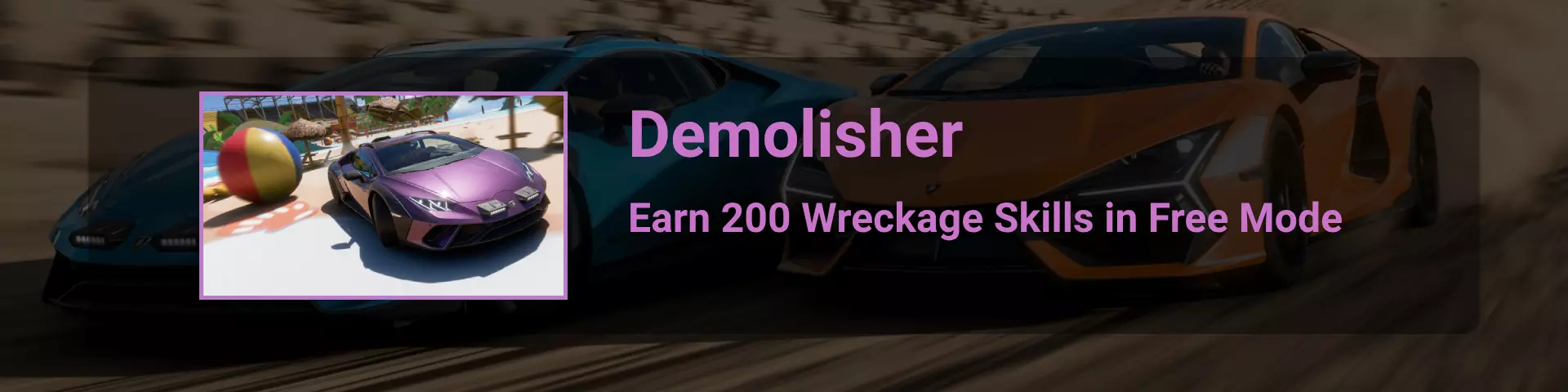 情况开始变得有些棘手。目前有5家制造商拥有25辆或更多车辆:宝马、雪佛兰、法拉利、福特和保时捷,但并非所有这些车辆都能直接购买。无论如何,你在轮盘赌游戏中都需要一点运气。最好忽略福特,因为游戏中有58辆福特车,而要获得制造商奖励,你需要解锁大部分车辆(并非全部)。另外,也忽略保时捷——和法拉利一样,太贵了。这样就剩下雪佛兰和宝马了。 所以,基本上,你只需要在游戏中查看,在进入名人堂时你拥有哪款车更多。如果你足够幸运,获得了宝马的奖励游戏,而非雪佛兰的,那么可以购买缺少的车辆,或者等待其他奖励掉落(比如花费500万 credits购买城堡,它能提供每日奖励游戏)。如果你只差一两辆车,可以查看拍卖行。如果拍卖行没有该车辆,继续参与奖励游戏,并留意季节活动和Forzathon商店的奖励,季节活动商店可以使用你的每日/每周/季节货币进行兑换。 有人说,收集25辆宝马并获得奖励后,宝马收藏并未计入成就。因此,为了稳妥起见,最好先收集雪佛兰! 碰撞测试 这是一个相当有趣的关卡,我们需要撞碎各种物体。不过,有两个成就的完成过程会相当漫长,因为需要等待系列活动。你需要立即留意【Treasure Hunter】和【Gotta Smash 'Em All】这两个成就。你可以浏览整个系列,以免在当月(也就是该系列期间)意外错过它们。要完成【Treasure Hunter】,你需要在单个系列中打破所有宝箱(宝箱数量可能因系列而异);而【Gotta Smash 'Em All】则需要完成“挑战”部分中5个名为“收藏品”的任务。后者很可能需要2到3个系列(月份)才能完成。