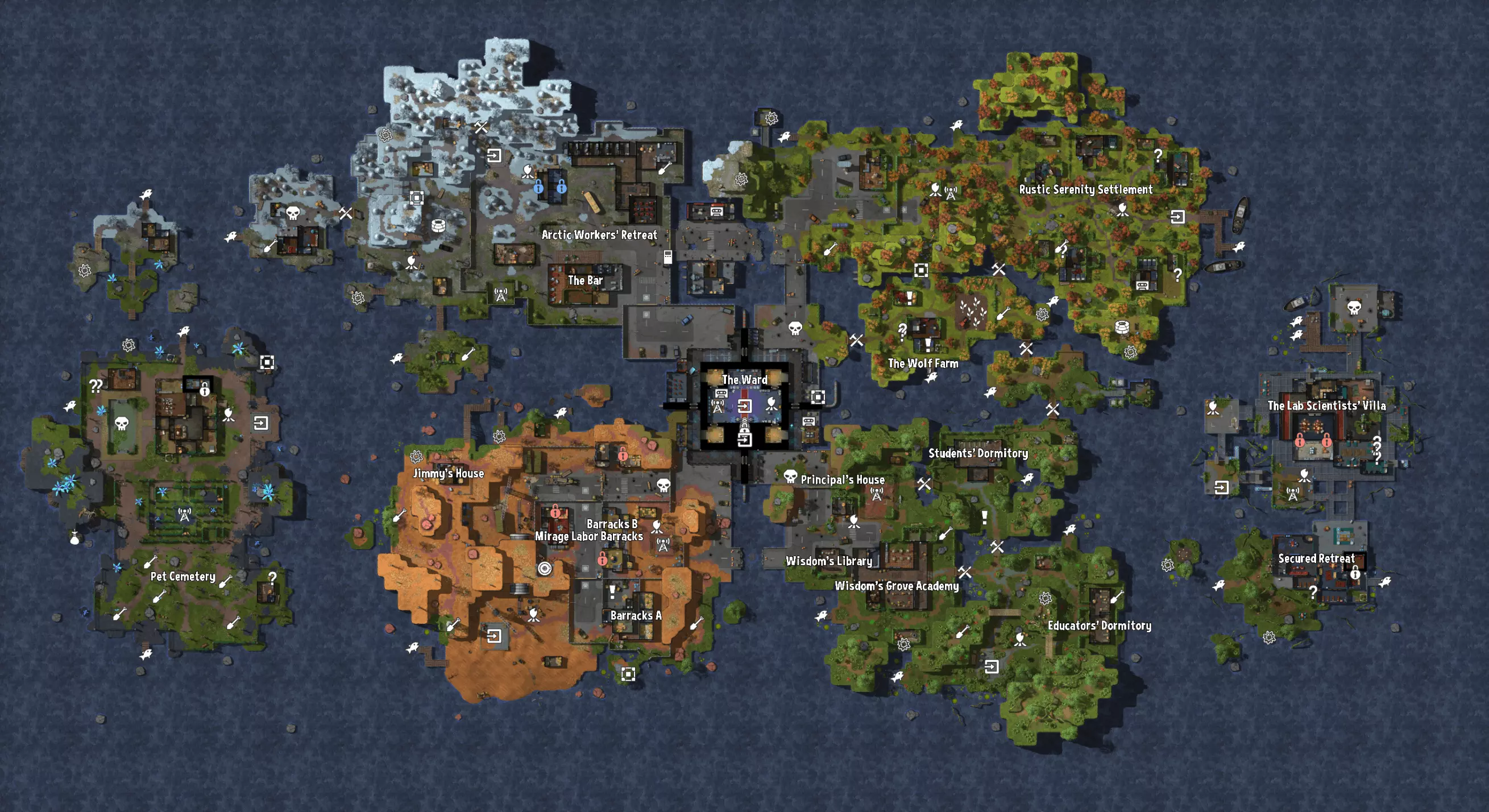 本指南包含所有兴趣点,例如任务、钓鱼点、古墓、限时宝箱、埋藏的宝藏以及其他一些内容。信息 本指南包含游戏的重大剧透。如果你不想被剧透并希望亲自探索游戏,请不要阅读本指南。 注意:地图中显示的某些区域可能无法进入。 本指南包含的位置:篝火、任务、收音机、 Boss、埋藏的宝藏、埋藏的传送器、限时宝箱、钓鱼点、竞技场方尖碑、连接塔、连接中继器、坟墓、许愿井、终端、入口、避难所、避难所扬声器、上锁的门、神话石板、可种植物、可修复物、音频日志、制造器、裂隙、魔力室、能量中继器、藏匿处、狗屋。 我将提供完整地图,然后单独提供游戏中的每个区域,以获得更好的质量。 本指南包含截至v1.4版本游戏中的所有兴趣点。互动地图 我为游戏制作了一张互动地图,你可以随心所欲地自定义地图。 功能: - 高清地图(24576×12288像素) - 5级缩放,从(1536×768像素)到(24576×12288像素) - 支持所有地图:岛屿、地下王冠、冥界、末日以及宠物与地下城 - 拥有与游戏中相同的【兴趣点】界面,让你了解自己错过了什么 - 大多数类型的详细信息,例如打开锁所需的钥匙或钓鱼点的类型 - 显示/隐藏塔边界 - 显示/隐藏位置名称 - 显示/隐藏特定类型的标记 地图图例
