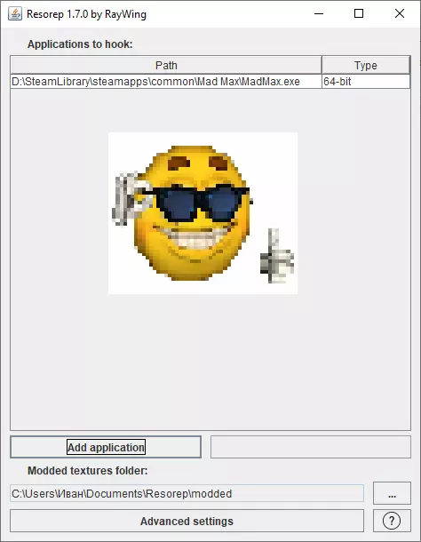3)运行resorep.jar(如果无法正常打开,尝试用Java程序打开;如果仍无法运行,则说明未安装Java) 4)点击“Add Aplication”,然后选择游戏根目录下的MadMax.exe 5)如需设置存放模组的文件夹,可在“Add Aplication”下方的“Modded textures folder”处进行指定