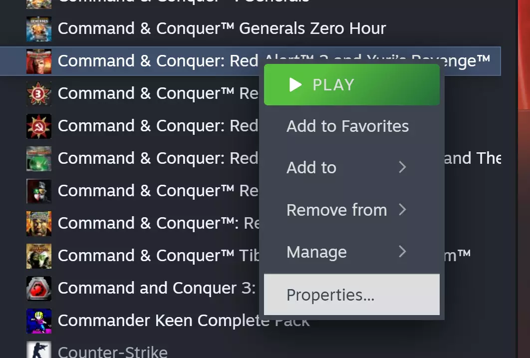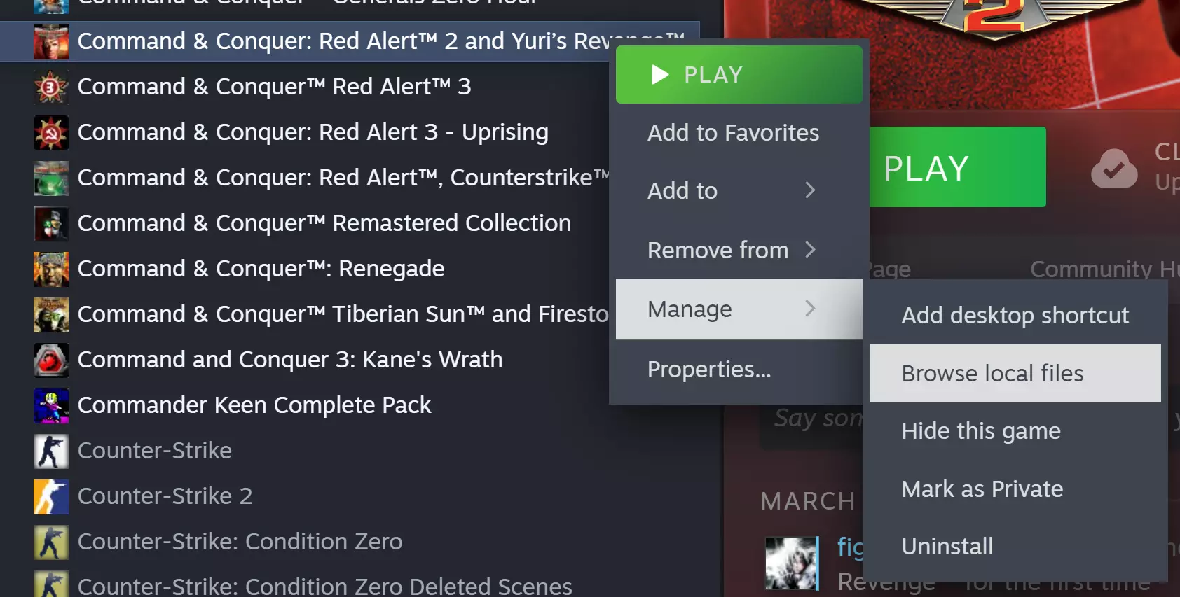 从桌面快捷方式启动尤里的复仇 随着最近的更新,尤里的复仇可以通过我们创建的新桌面快捷方式启动。 1. 在Steam中,右键点击【命令与征服:红色警戒2及尤里的复仇】,然后选择【管理】>【浏览本地文件】。