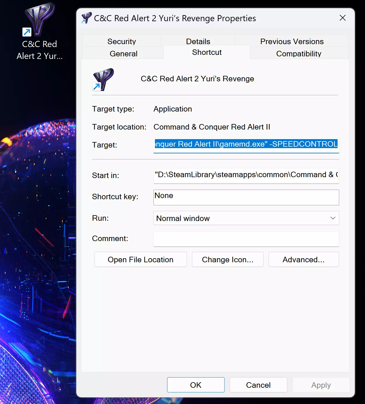 从桌面快捷方式启动《命令与征服:红色警戒2》 可以通过Steam创建的桌面快捷方式启动《命令与征服:红色警戒2》。将原始快捷方式重命名为“Command & Conquer: Red Alert™ 2”,因为该快捷方式仅用于启动该游戏。此外,右键点击快捷方式,在“目标”栏的末尾添加 -SPEEDCONTROL,以启用在设置菜单中编辑游戏速度的功能。