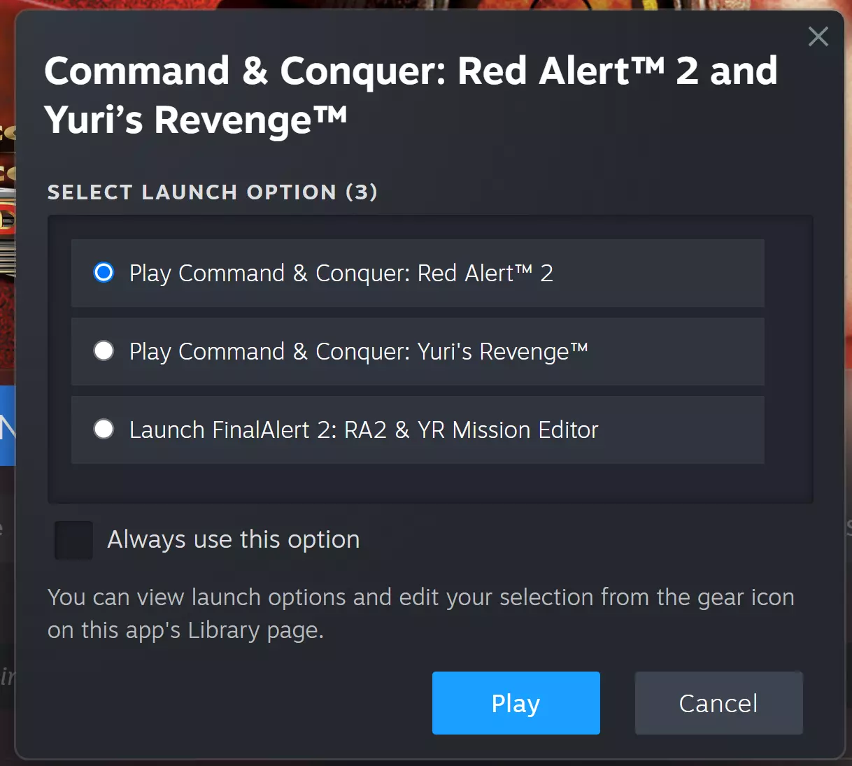 启动《红色警戒2》、《尤里的复仇》及最终警报 通过Steam启动《红色警戒2》、《尤里的复仇》或最终警报(地图编辑器) 若要游玩《红色警戒2》或《尤里的复仇》,请直接通过Steam打开游戏。点击Steam内的【开始】按钮,然后选择【红色警戒2】或【尤里的复仇】。你也可以通过此方式启动地图编辑器【最终警报】。