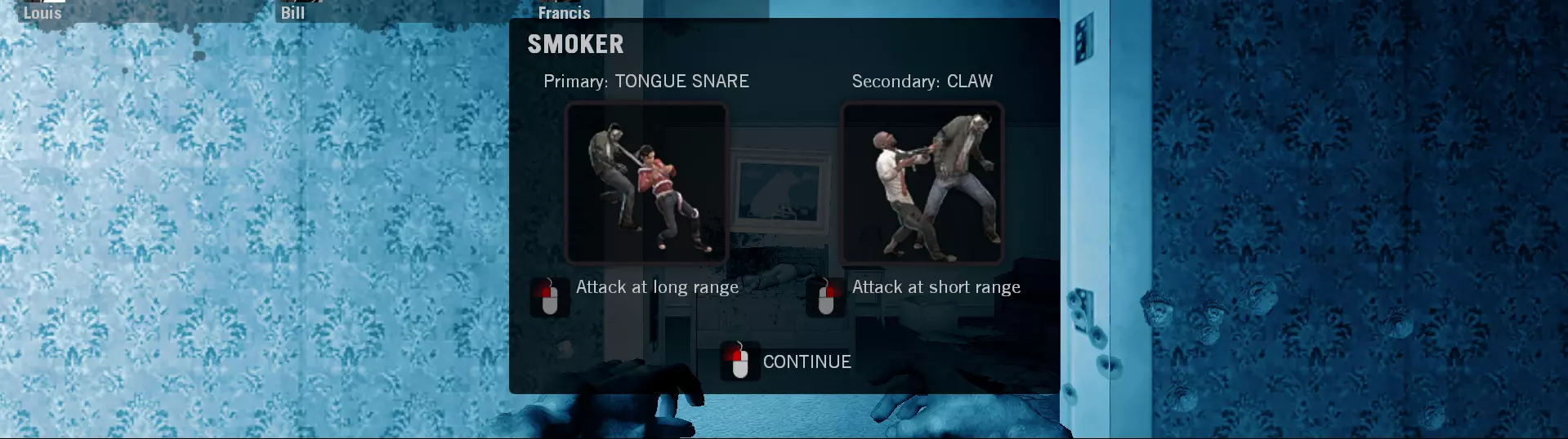 作为吸烟者用舌头拖拽一名幸存者100英尺。 踢3个机器人后倒下并变为感染者,同时分裂你正对的幸存者。