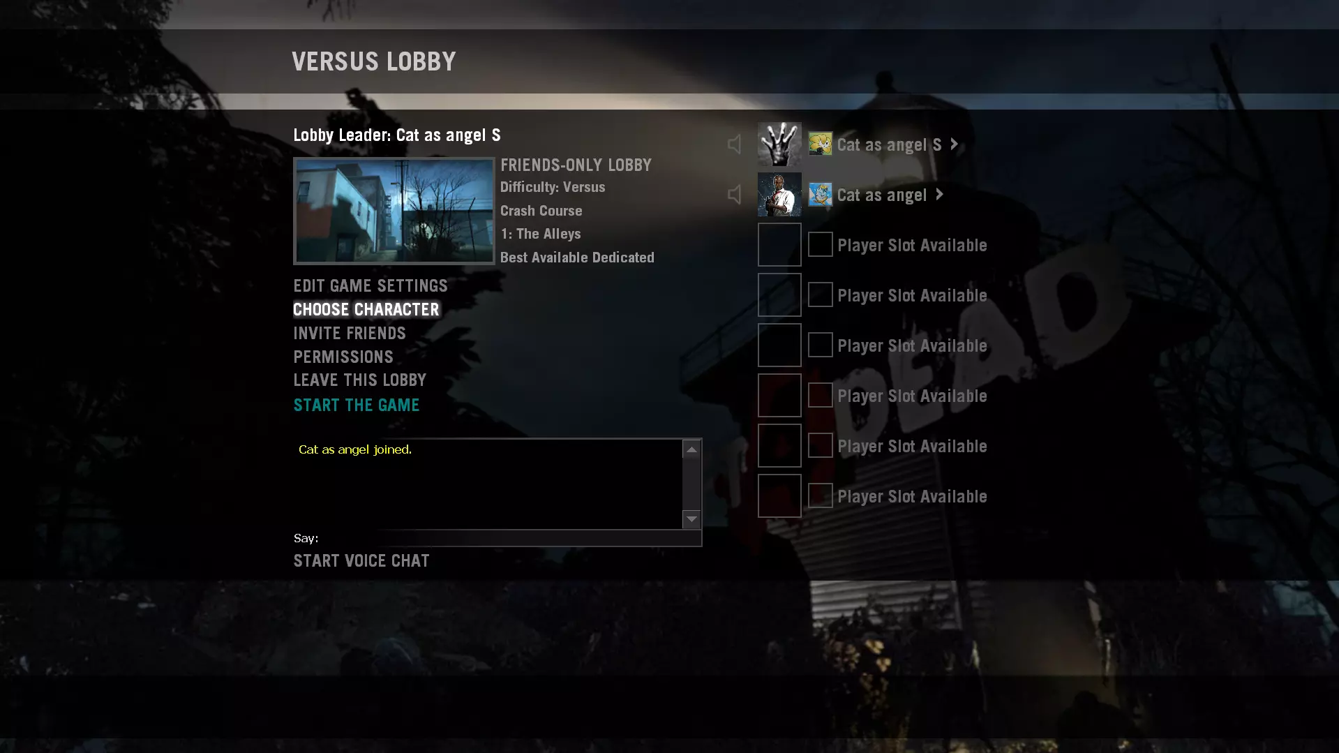 【WIPEFEST】:在“坠机险途”战役中,你的队伍在五秒内使三名幸存者失去行动能力。 【此成就无法单人完成】 创建大厅: 战役选择:坠机险途 1:后巷 名称 选择角色 主角色:感染者 副角色:幸存者
