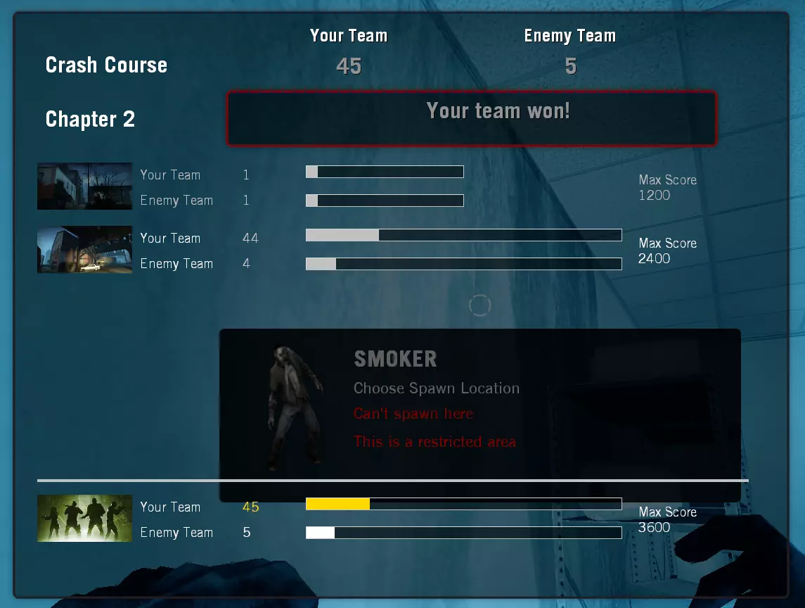 注意:如果你是“Boomer”(胖子)并对“Bot”(机器人)呕吐,尸潮将不会被计数。 - 你操控的幸存者若以某种方式分裂,进入安全区后将不会被计数。