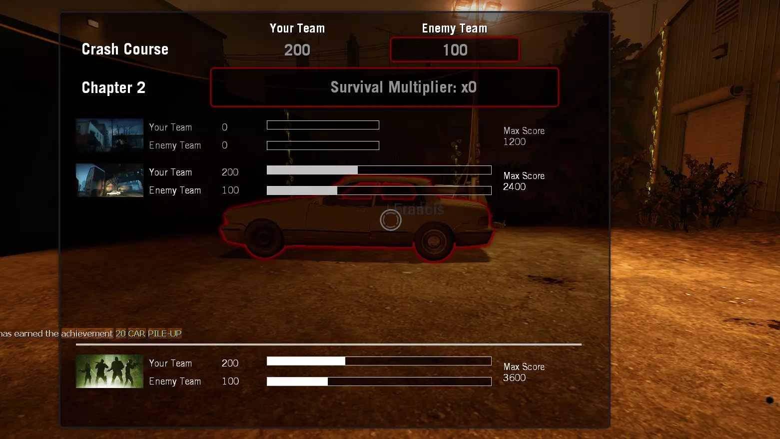 作为特殊感染者对幸存者造成总计5000点伤害。 作为感染者攻击、呕吐或 incap bots,直到达到5000点。 【求生之路】【成就】 控制台地图: map l4d_garage01_alleys versus 【开始崩溃课程】 map l4d_garage02_lots versus 【最终崩溃课程】