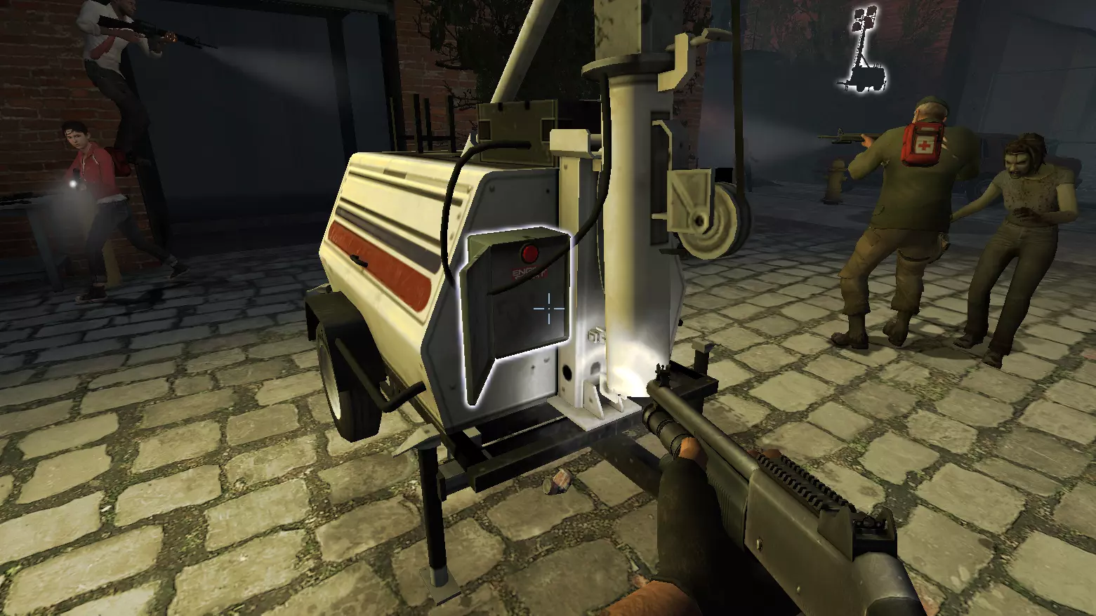 【卡车停靠点】在《求生之路2》的“坠机险途”章节中,当救援车辆的门打开后,你的队伍消灭了所有幸存者。 说明:在最终战役中,启动发电机后,像下图所示那样跳到发电机顶部。