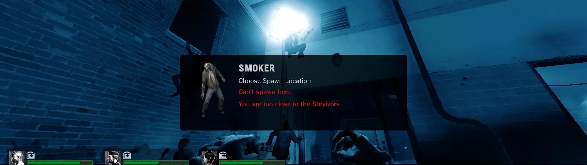 作为感染者选择吸烟者,然后切换队伍至幸存者,再切换回感染者。 如果你是胖子,将吸烟者踢出。 扮演胖子后再次切换为吸烟者。 等待胖子向电脑角色呕吐,然后使其中一个被吐到的电脑角色失去行动能力。