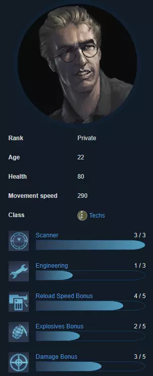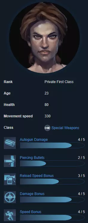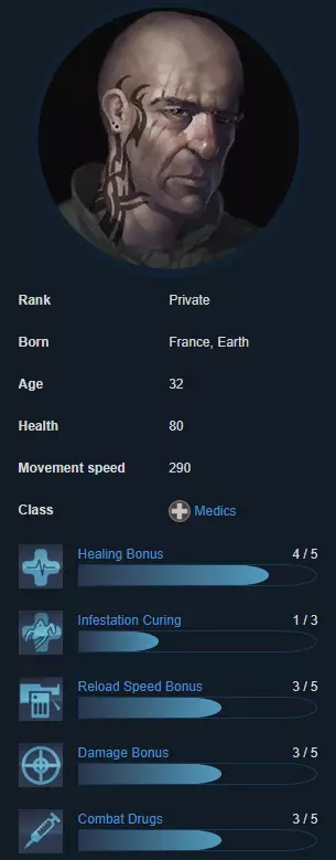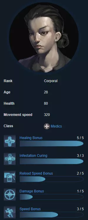 Crash拥有与Sarge相同的爆炸物加成,但生命值低得多。他的最佳位置是在队伍中间,紧跟在Vegas和Jaeger身后,作为第二名榴弹发射器使用者。 任务:在前线协助Vegas和Jaeger,处理队伍中间的无人机 支援者(也称治疗者) 每个陆战队员在某种程度上都是其他队员的支援者,但这个类别专为医疗兵保留,因为这完全符合他们的定位。医疗兵最好使用特斯拉炮,许多新玩家因其低伤害而低估了它,尽管它是游戏中最好的支援武器之一。优秀的特斯拉炮医疗兵能让游戏难度降低10倍。作为支援角色,你的职责是掩护团队中的所有成员,尤其是榴弹发射器使用者。如果要论延迟问题,医疗兵是最容易被原谅的,不过高延迟下使用特斯拉可能会有问题。伊娃“信念”延森