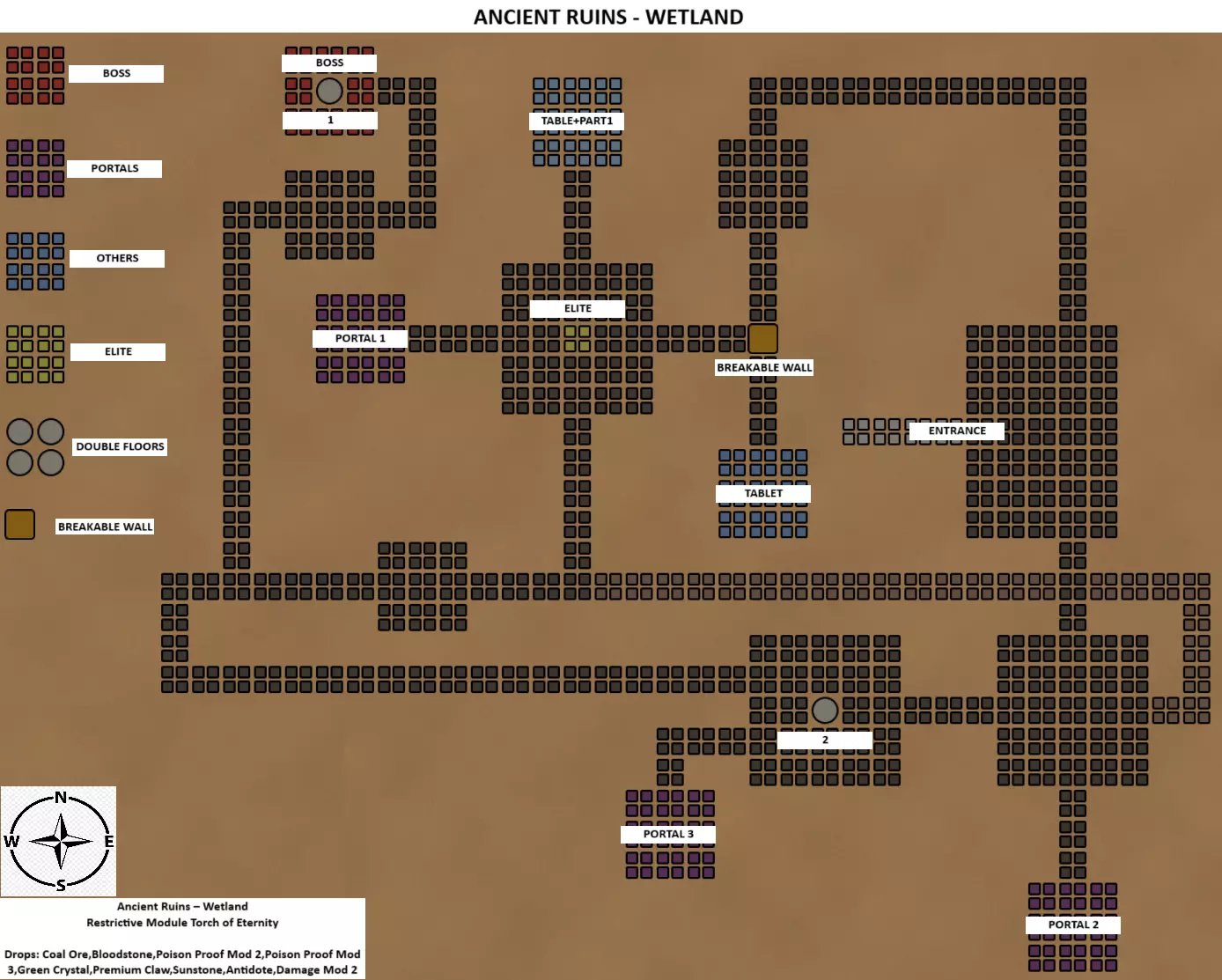 远古遗迹 - 湿地 限制模块 永恒火炬 传送门部件1/2/3,神秘石桌+部件1 远古遗物可能掉落: 煤炭矿石、血石、防毒模块2和3、绿水晶、高级利爪、太阳石、解毒剂、伤害模块2