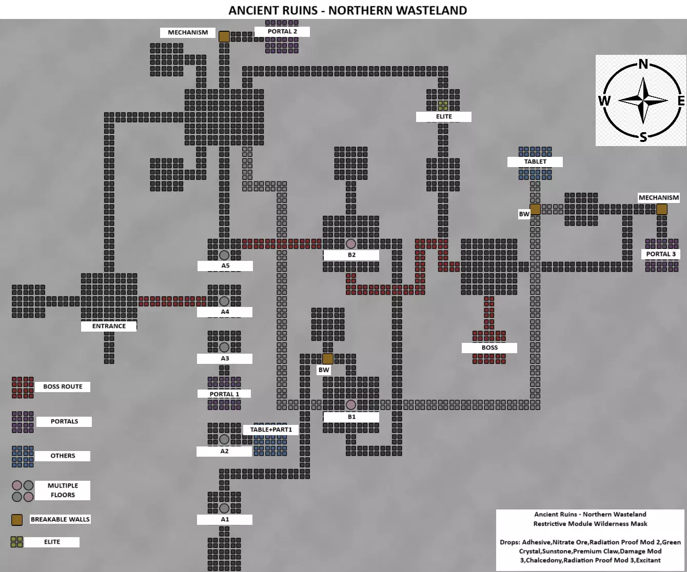 远古遗迹 - 北方荒原 限制模块:荒野面具 神秘石桌 + 第一部分,传送门零件1/2/3 远古遗物可能掉落: 粘合剂、硝酸盐矿石、防辐射模块2、绿水晶、太阳石、高级利爪、伤害模块3、玉髓、防辐射模块3、兴奋剂