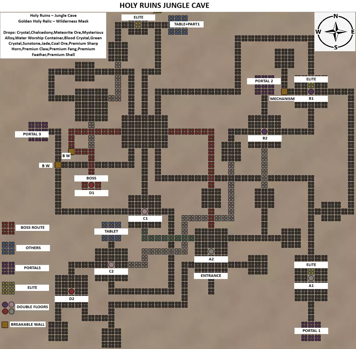 神圣遗迹 - 丛林洞穴 荒野面具 机械齿轮与武器、传送门零件1、2、3、神秘石桌+零件1 古代遗物可能掉落: 水晶、玉髓、陨石矿、神秘合金、水之崇拜容器、血水晶、绿水晶、太阳石、玉石、煤矿、优质尖角、优质利爪、优质尖牙、优质羽毛、优质贝壳