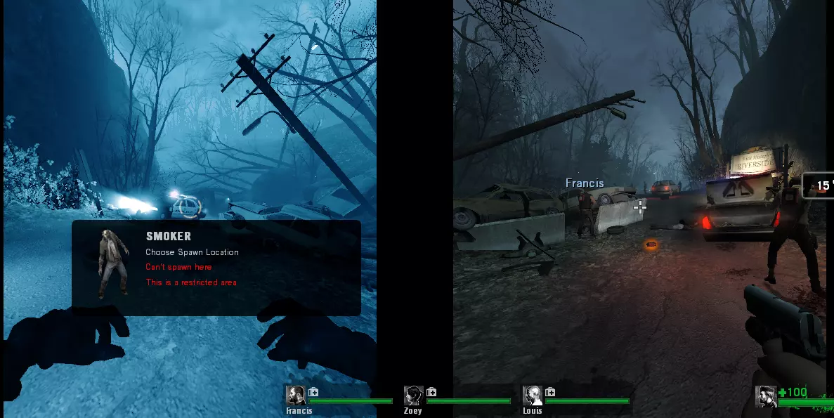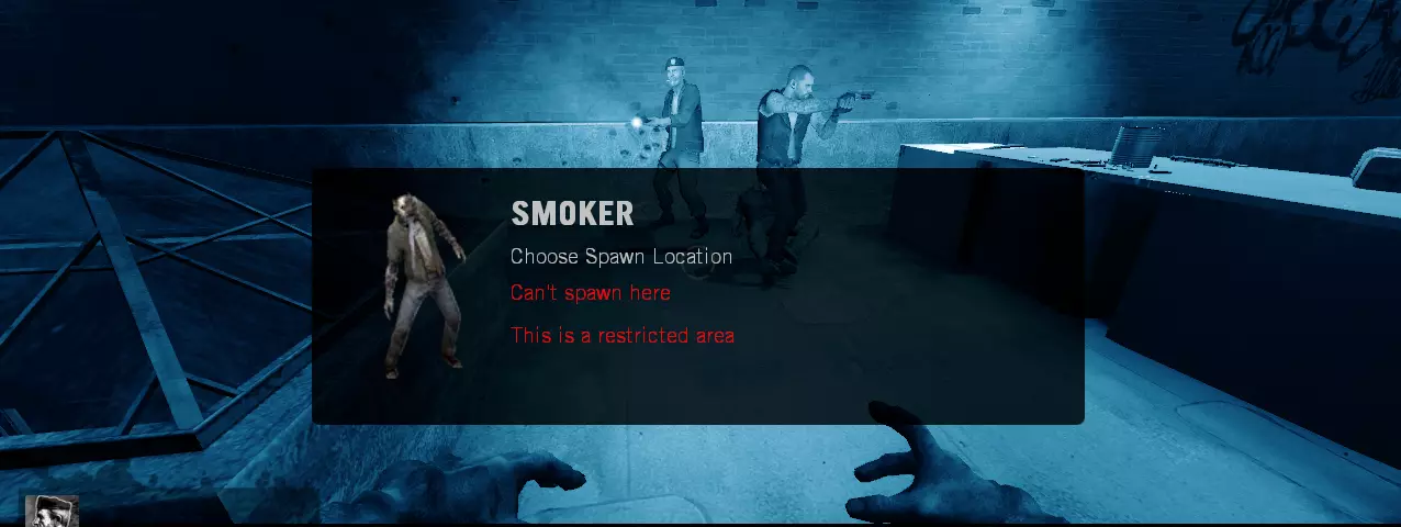 分屏:需要 AI感染者:不需要 选择地图:后巷 地图指令:map l4d_garage01_alleys versus 加载地图后,若未处于感染者队伍则切换至感染者队伍;将分屏玩家连接至幸存者队伍。 若你不是吸烟者,在可重生时自杀或重启游戏直至成为吸烟者。踢出AI幸存者。成为吸烟者后重生。
