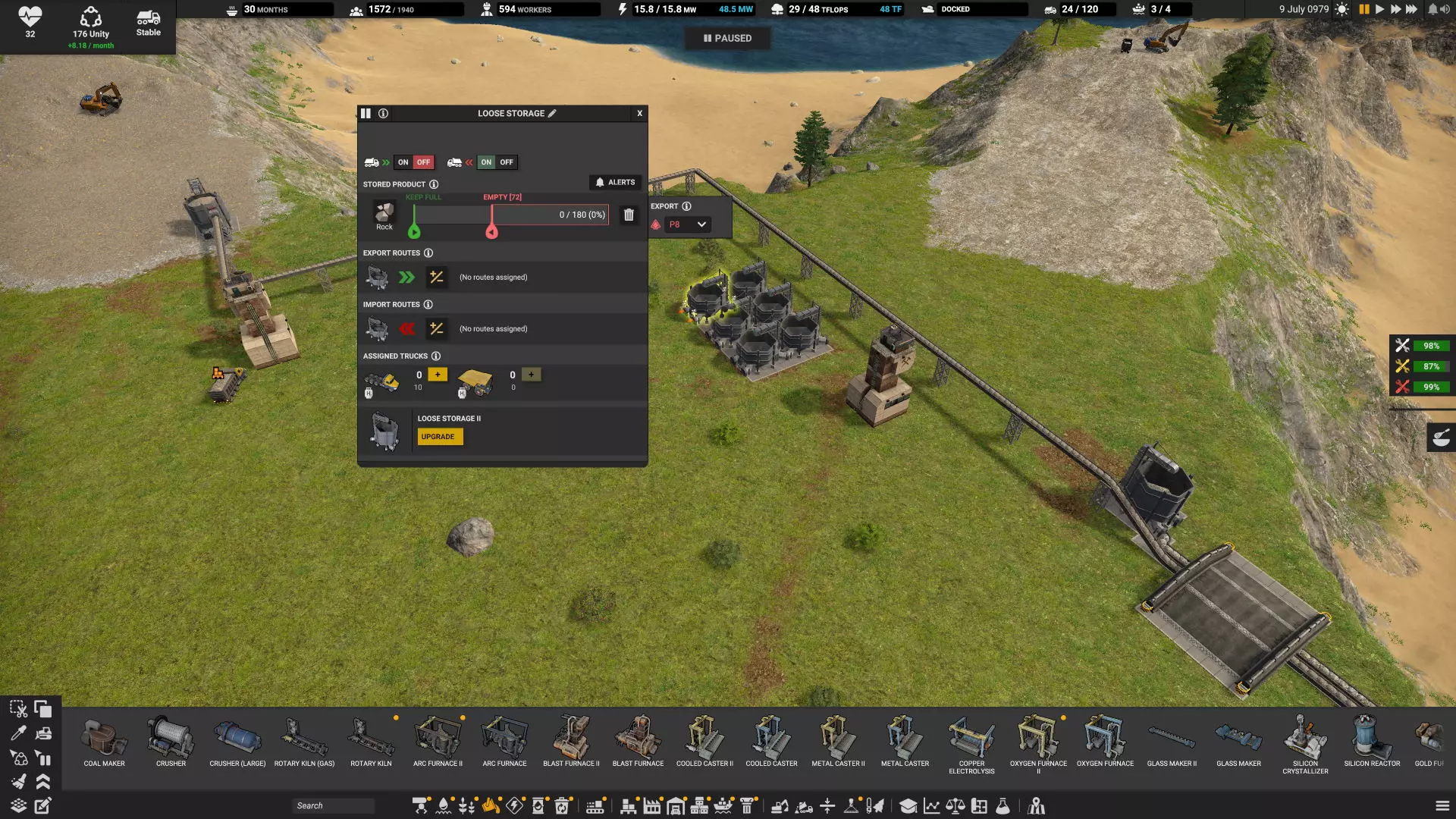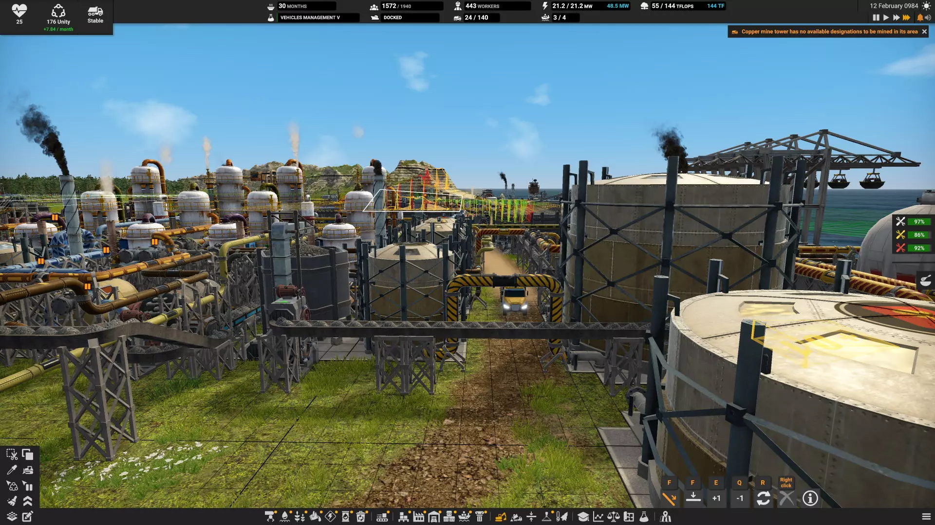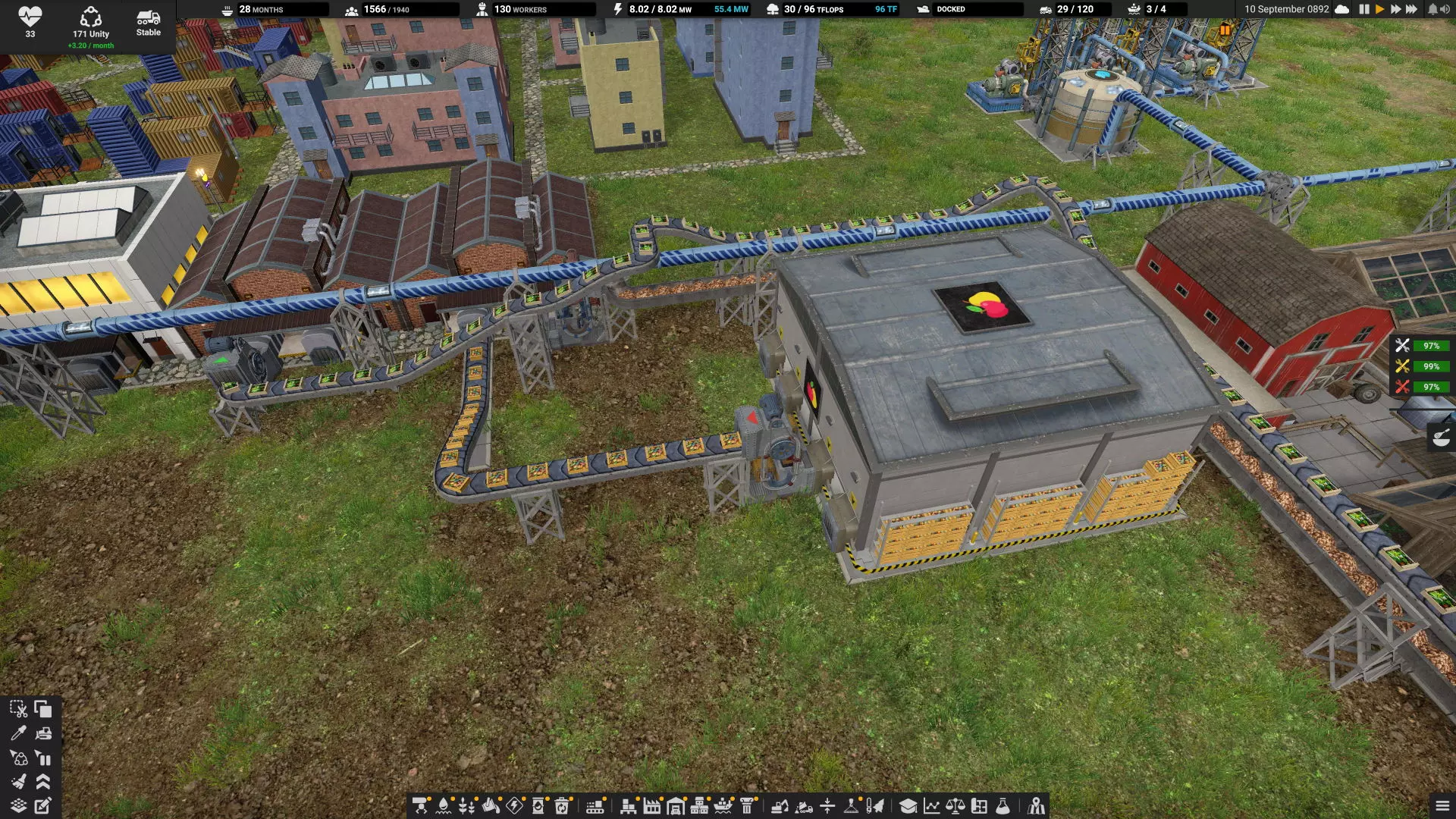 步骤4:禁用所有机器的卡车导入功能 这一步比之前的步骤耗时更长。前提是你的目标是用更多的管道、传送带和战略性放置的存储设施来替代部分卡车。 我发现当水或酸被输送到各个机器(如锅炉、电解装置和微芯片制造机)时,存在许多连接问题。部分管道接反(导致无法流动),部分传送带和管道仍处于暂停状态,因此从未完全建成或正常运行。烟囱和液体排放口常常未达到容量。你可能需要将此步骤分解为:先调整制造布局中的一个独立区域,然后再进行下一个区域。 4a:观察卡车的运行情况并确认负载传输是否正常。检查它们反复经过的老路。能缩短这些路径吗? 垃圾场往往会变成闲置卡车的停车场。在【车辆管理】弹窗中留意闲置卡车数量,以了解实际需要多少辆。如果它们大部分时间都停着闲置,但你仍遇到非手动触发的忙碌状态,那一定是哪里出了问题。 4b:一次在一条生产线上禁用卡车进口,观察是否缺少任何投入资源导致生产无法继续。 4c:监控废料产出,确保处理能力足够。 4d:检查机器弹窗的左上角,确保它没有显示【缺少输入】【等待产品】或在不该满的时候显示【输出已满】。正确连接后,自动设置可以正常工作,但为了检测连接问题,最好始终设为关闭。 结论 很长一段时间,我都没注意到农场区域角落里的小谷仓有传送带输出接口。所以一定要将每个田地连接到正确的存储设施,以避免卡车随机出现忙碌状态。由于我的农场就在定居点旁边,直接用传送带连接食品市场很方便。